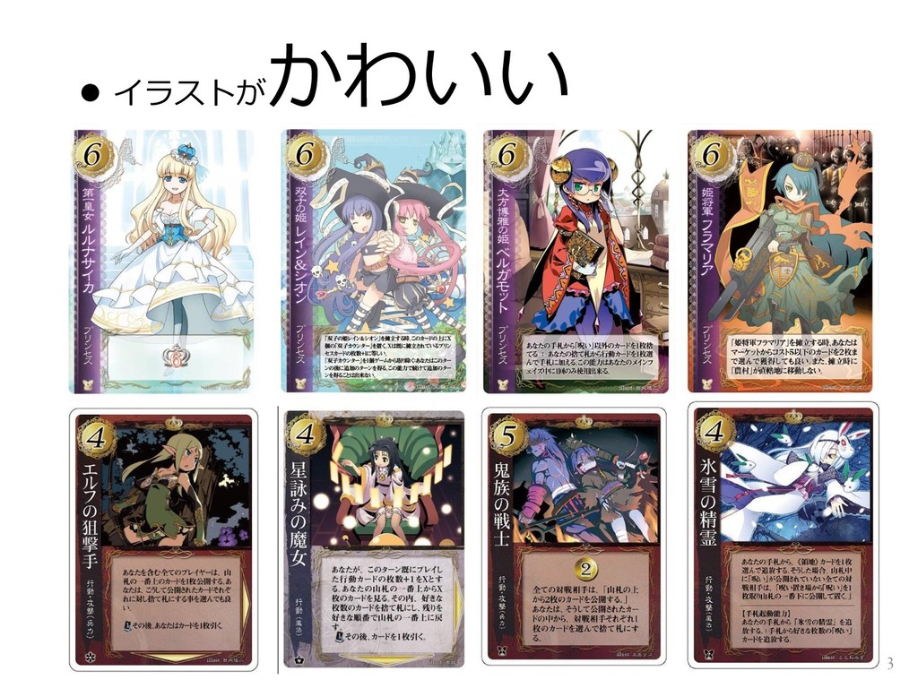 組み合わせは30万通り以上 防御を優先 ひたすら強化 姫 姫 妨害が得意 買い物が得意 姫も六人以上 どの姫にするか ⚫ 状況に合わせてデッキの構成を考えること ⚫ 最適解が見つけづらく何回でも遊べること ハトクラの面白さ