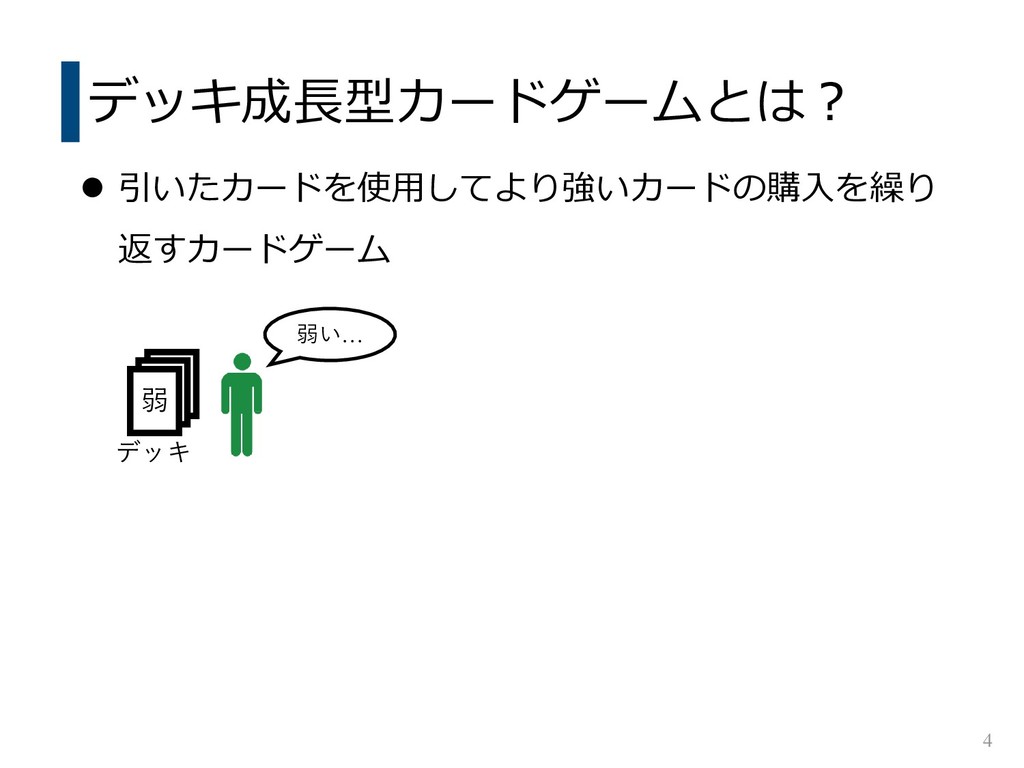 ⚫ 引いたカードを使用してより強いカードの購入を繰り 返すカードゲーム デッキ成長型カードゲームとは? 4 弱 デッキ 弱い…