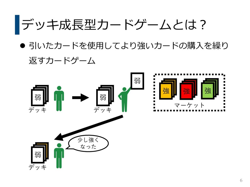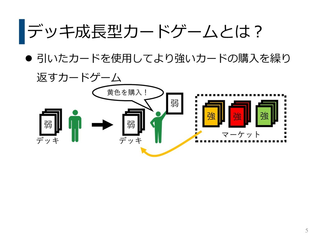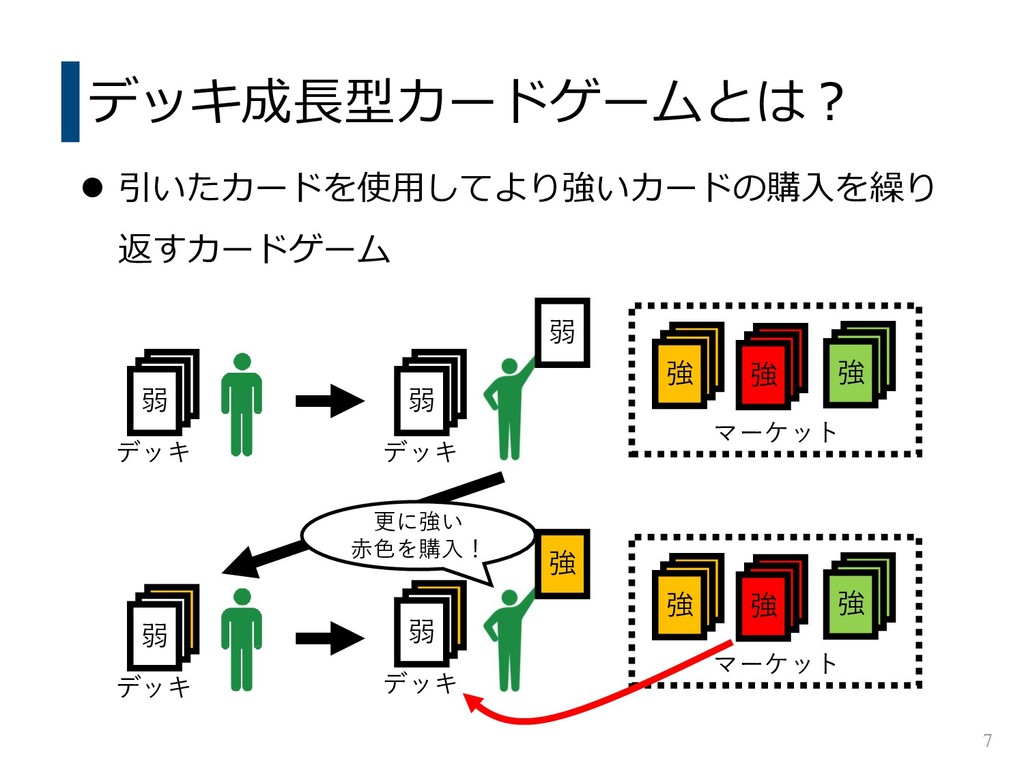 弱 デッキ 強 強 強 マーケット 強 弱 デッキ 更に強い 赤色を購入! ⚫ 引いたカードを使用してより強いカードの購入を繰り 返すカードゲーム デッキ成長型カードゲームとは?