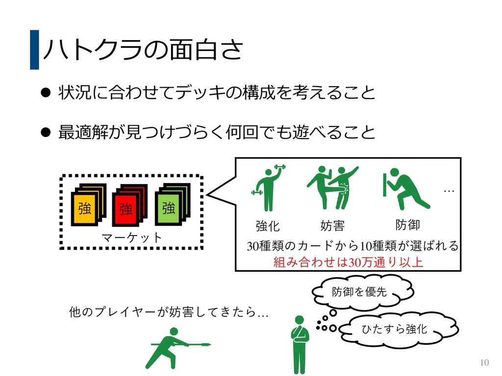 強化 妨害 防御 30種類のカードから10種類が選ばれる … 組み合わせは30万通り以上 防御を優先 ひたすら強化 他のプレイヤーが妨害してきたら…