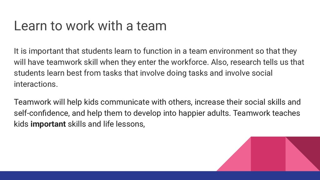 students learn to function in a team environment so that they will have teamwork skill when they enter the workforce. Also, research tells us that students learn best from tasks that involve doing tasks and involve social interactions. Teamwork will help kids communicate with others, increase their social skills and self-confidence, and help them to develop into happier adults. Teamwork teaches kids important skills and life lessons,