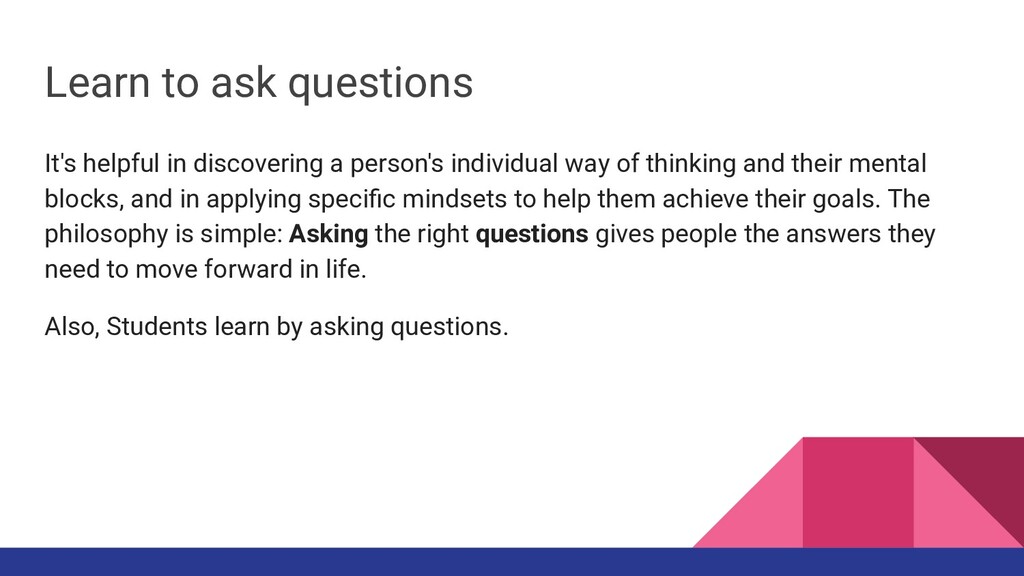 individual way of thinking and their mental blocks, and in applying specific mindsets to help them achieve their goals. The philosophy is simple: Asking the right questions gives people the answers they need to move forward in life. Also, Students learn by asking questions.
