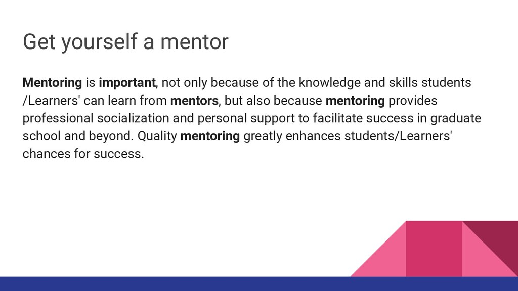 of the knowledge and skills students /Learners' can learn from mentors, but also because mentoring provides professional socialization and personal support to facilitate success in graduate school and beyond. Quality mentoring greatly enhances students/Learners' chances for success.