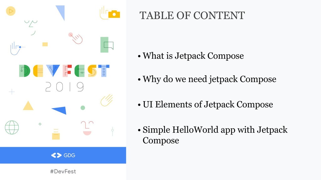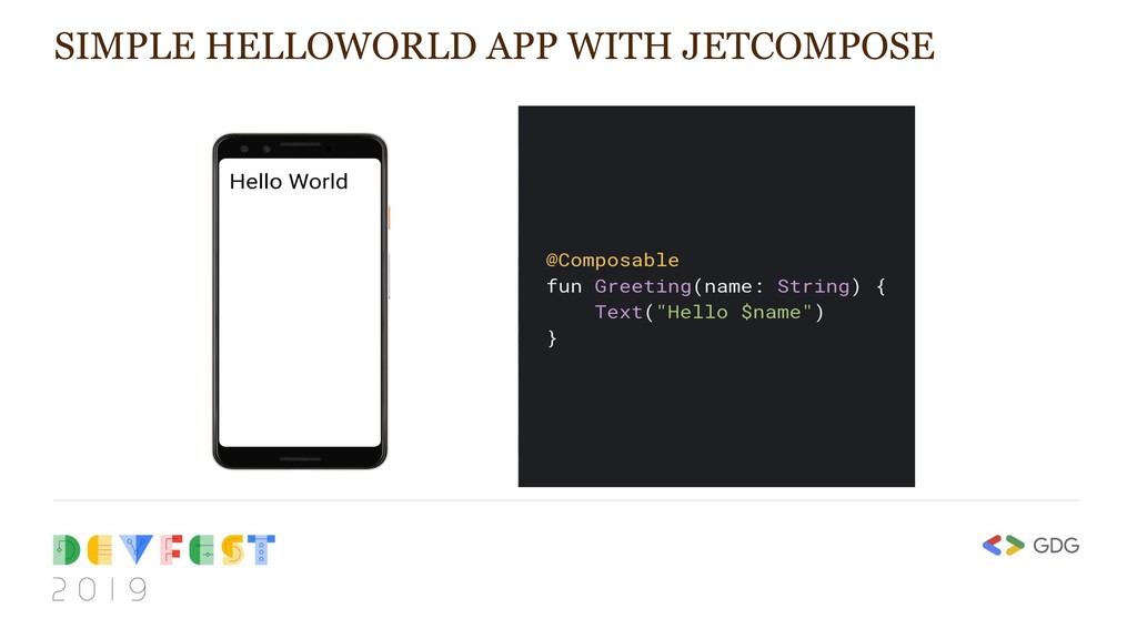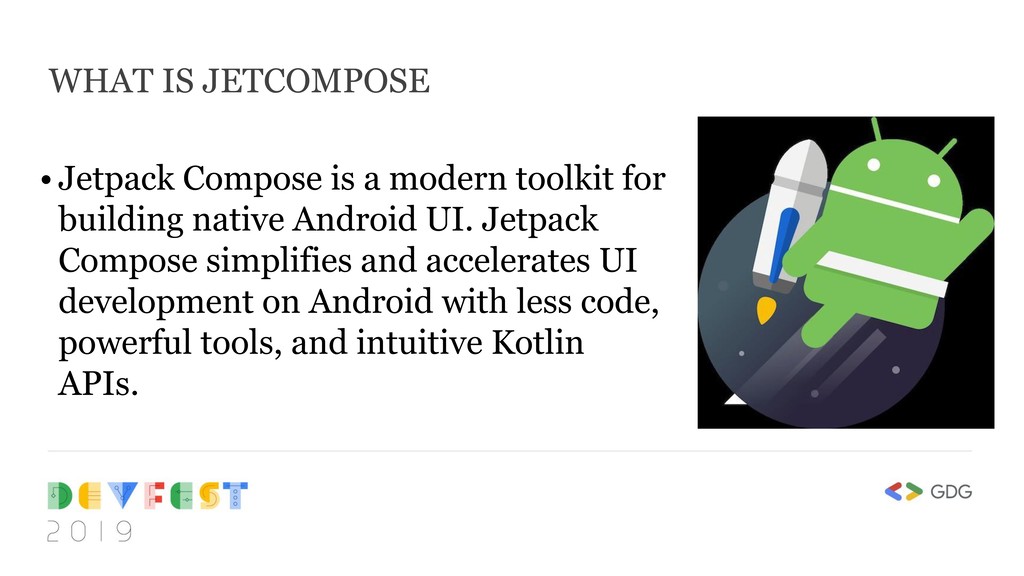 that Kotlin brings • Declarative — Fully declarative for defining UI components • Compatible — Compatible with existing views • Enable Beautiful Apps — Designed with Material Design • 100% Kotlin – written in Kotlin programming language WHY DO WE NEED JETCOMPOSE