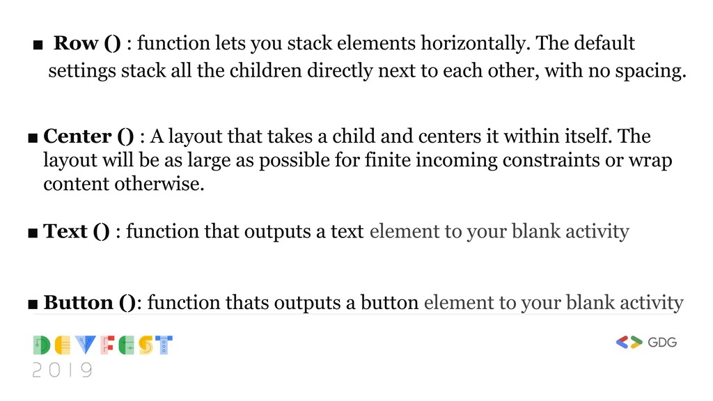 The default settings stack all the children directly next to each other, with no spacing. ▪ Center () : A layout that takes a child and centers it within itself. The layout will be as large as possible for finite incoming constraints or wrap content otherwise. ▪ Text () : function that outputs a text element to your blank activity ▪ Button (): function thats outputs a button element to your blank activity