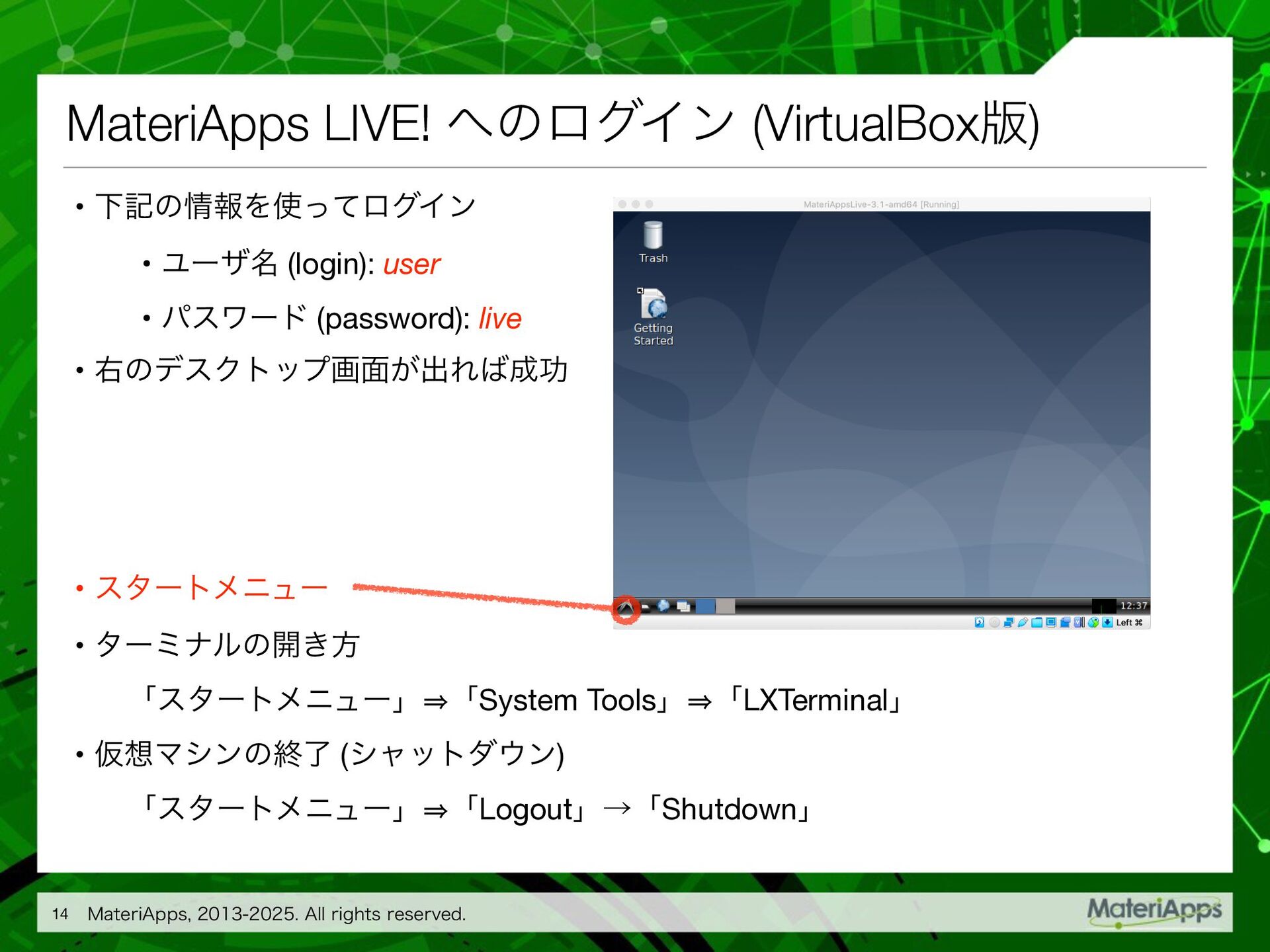 Feram, DCore, DSQSS, HΦ, LAMMPS, ɹɹɹɹɹɹɹɹɹɹɹɹɹɹɹ mVMC, OCTA, OpenMX, Quantum ESPRESSO,ɹɹɹɹɹɹɹɹɹɹɹɹɹɹɹɹɹ PHYSBO, SMASH, TeNeS, xTAPP • OVITO, ParaView, Tapioca, VESTA, XCrysDen… • CASINO, GAMESS, VMD༻Πϯετʔϥʔ • MateriApps LIVE! αΠτ͔ΒμϯϩʔυՄೳ • 20137݄Ҏདྷɺ15,000+ίϐʔΛ .BUFSJ"QQT "MMSJHIUTSFTFSWFE 6