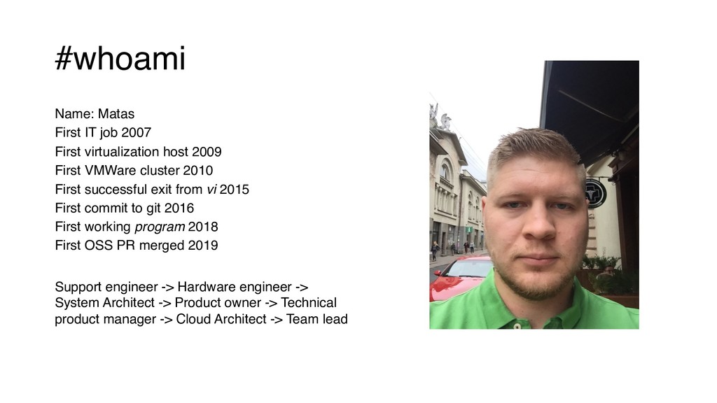2009 First VMWare cluster 2010 First successful exit from vi 2015 First commit to git 2016 First working program 2018 First OSS PR merged 2019 Support engineer -> Hardware engineer -> System Architect -> Product owner -> Technical product manager -> Cloud Architect -> Team lead