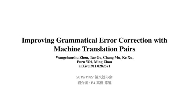Corpus [Ziemski et al., 2016] • 15M parallel sentence pairs with around 400M tokens Monolingual Chinese corpora (for synthesize GEC data) • news2016zh [Xu, 2019] • news corpus containing 2.5M Chinese news articles In experiments, • 10M pseudo-parallel data (SMT-NMT) • 10M sentence pairs (SMT-gold) • To compare : NewsCrawl dataset + random corruption (40M sents) [Zhao et al., 2019] • Filter the generated corpora based on the fluency [Ge et al., 2018] • Discard : fluency of target sentence is lower than that of the source sentence