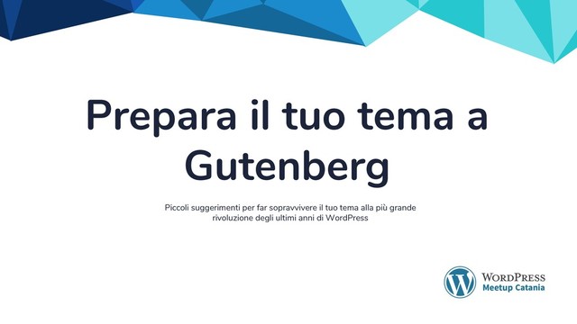 Nell'appuntamento di Settembre 2018 del WordPress Meetup Catania, Francesco Grasso ci ha parlato nuovamente di Gutenberg. Questa volta con un focus su alcune nuove funzionalità dell'editor. In particolare allineamenti immagini e possibilità di abilitare/disabilitare la gestione del colore per i testi.