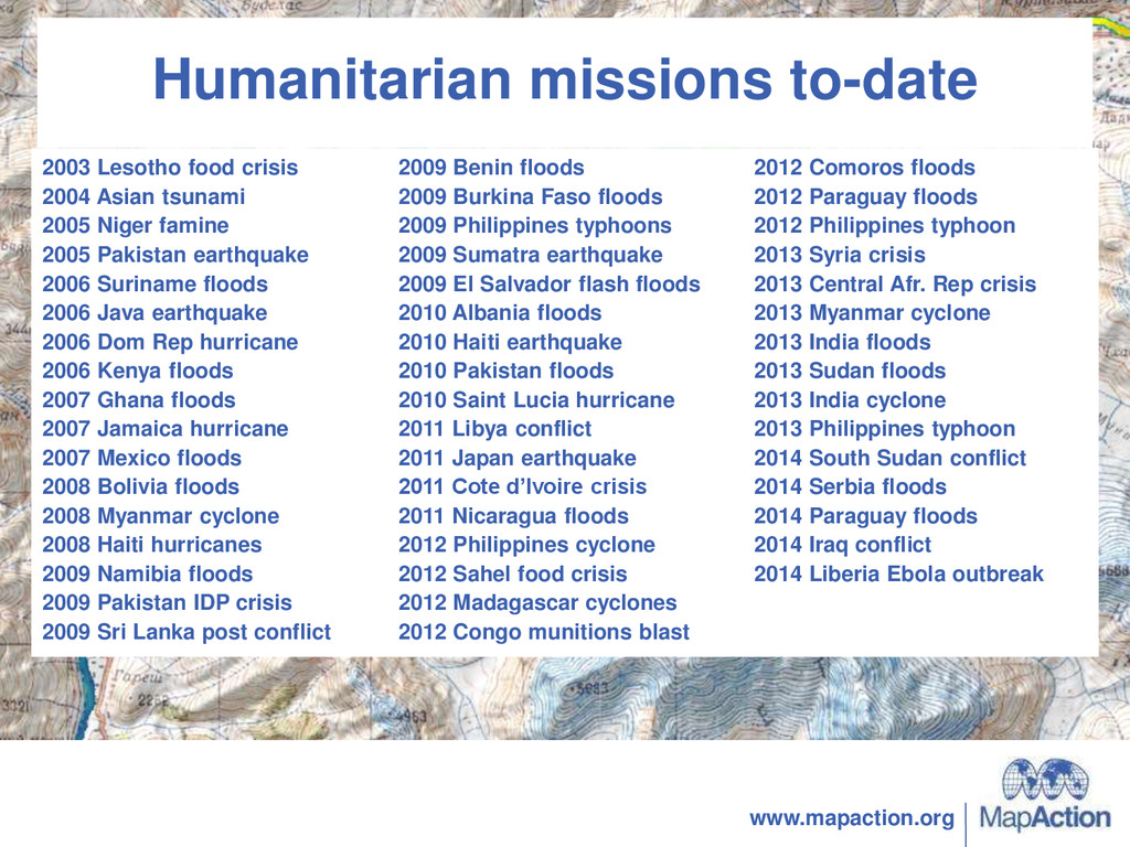 www.mapaction.org Humanitarian missions to-date 2003 Lesotho food crisis 2004 Asian