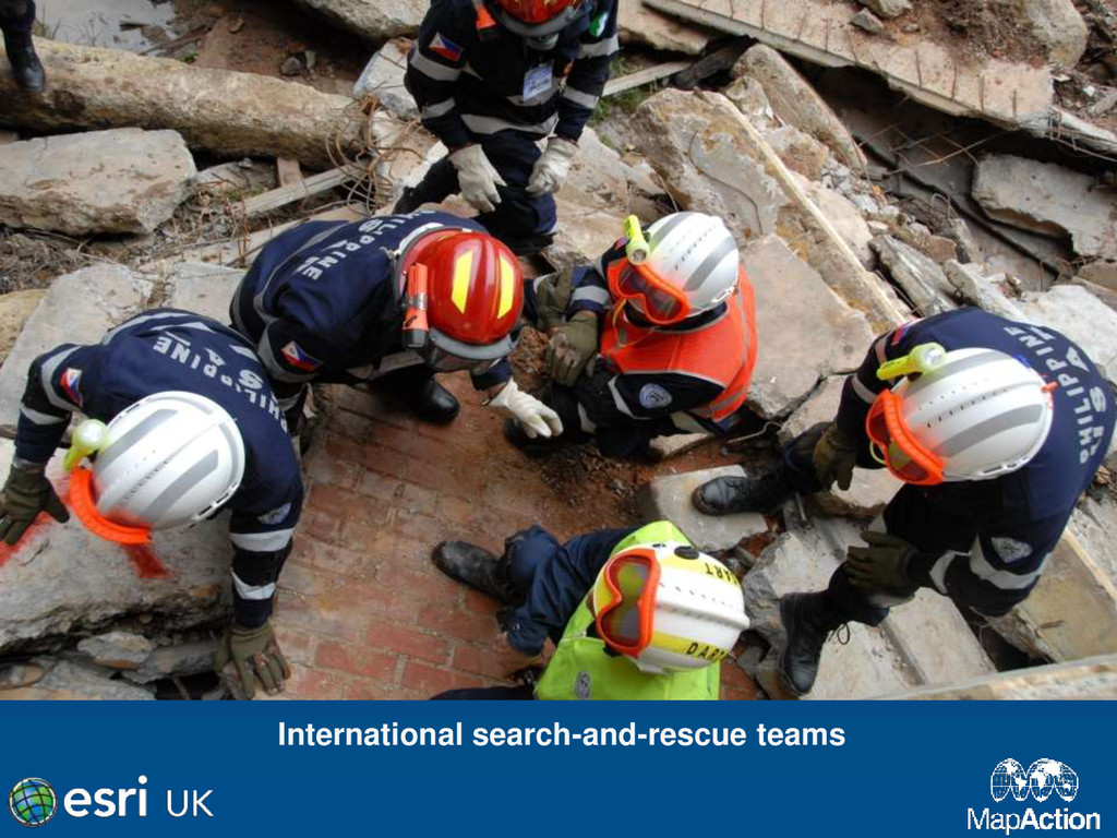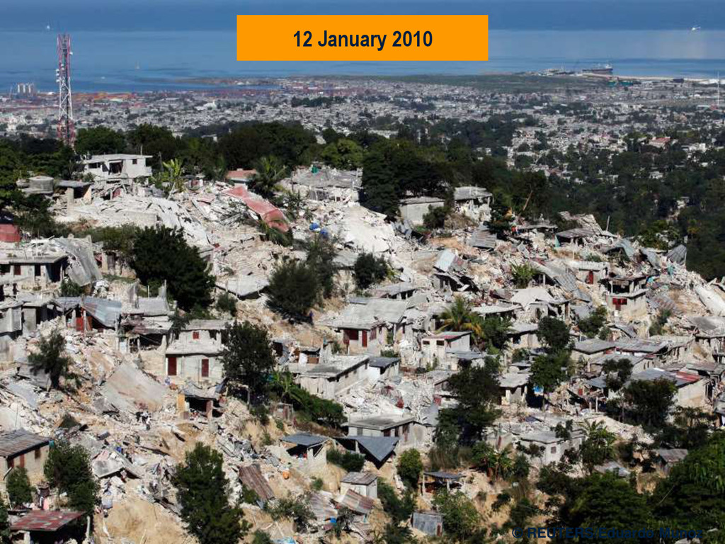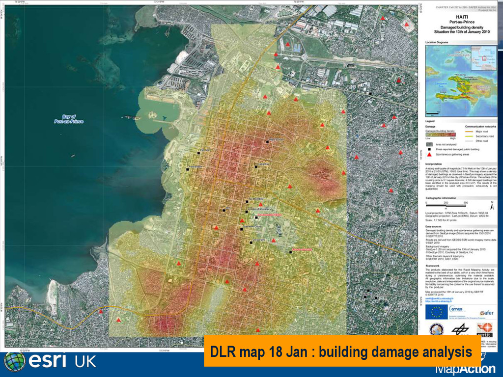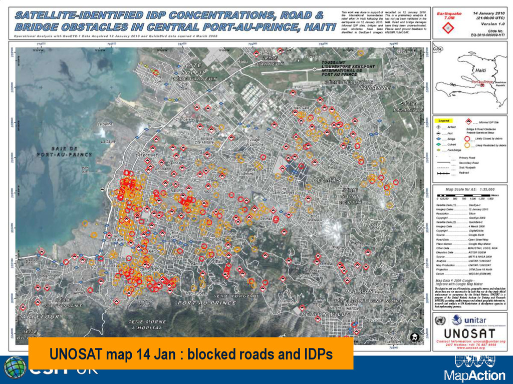in southern Haiti, about 15km from Port au Prince (PAP) on Tuesday 12 January, at 16:53 local time (21:53 UK). • Damage assessment from the air not reliable. • Previous mission data proved invaluable. • MapAction filled in the IM gap • SAR worked 24+ hours at a stretch • Crowdsourced data very useful • Mission 4636