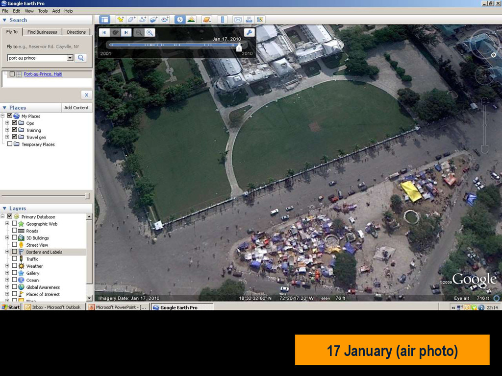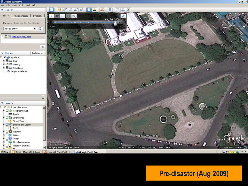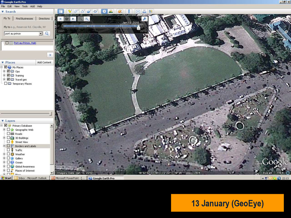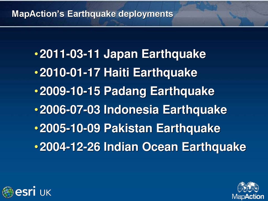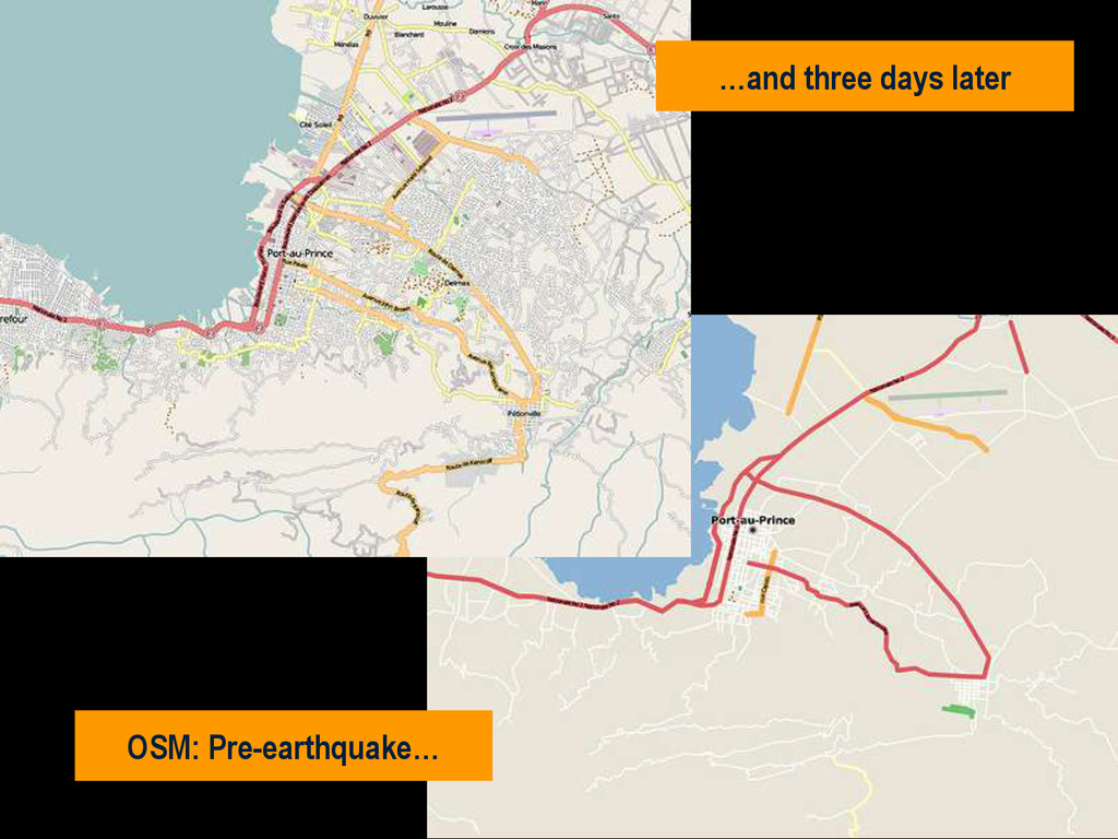 in southern Haiti, about 15km from Port au Prince (PAP) on Tuesday 12 January, at 16:53 local time (21:53 UK). • Damage assessment from the air not reliable. • Previous mission data proved invaluable. • MapAction filled in the IM gap • SAR worked 24+ hours at a stretch • Crowdsourced data very useful • Mission 4636