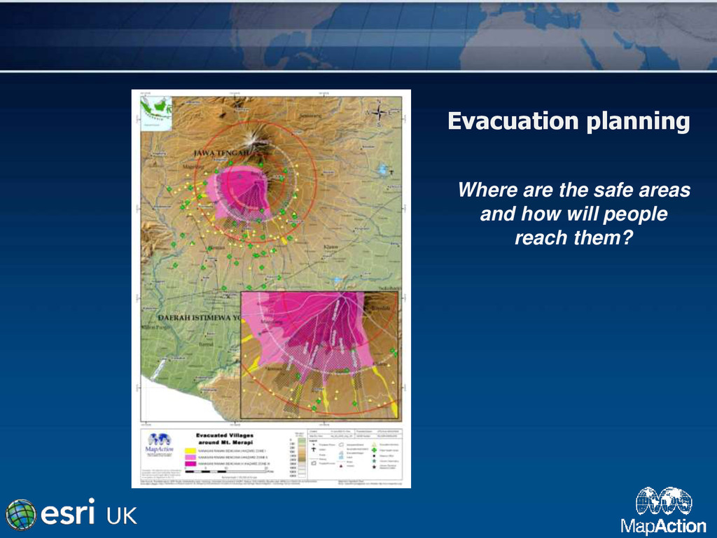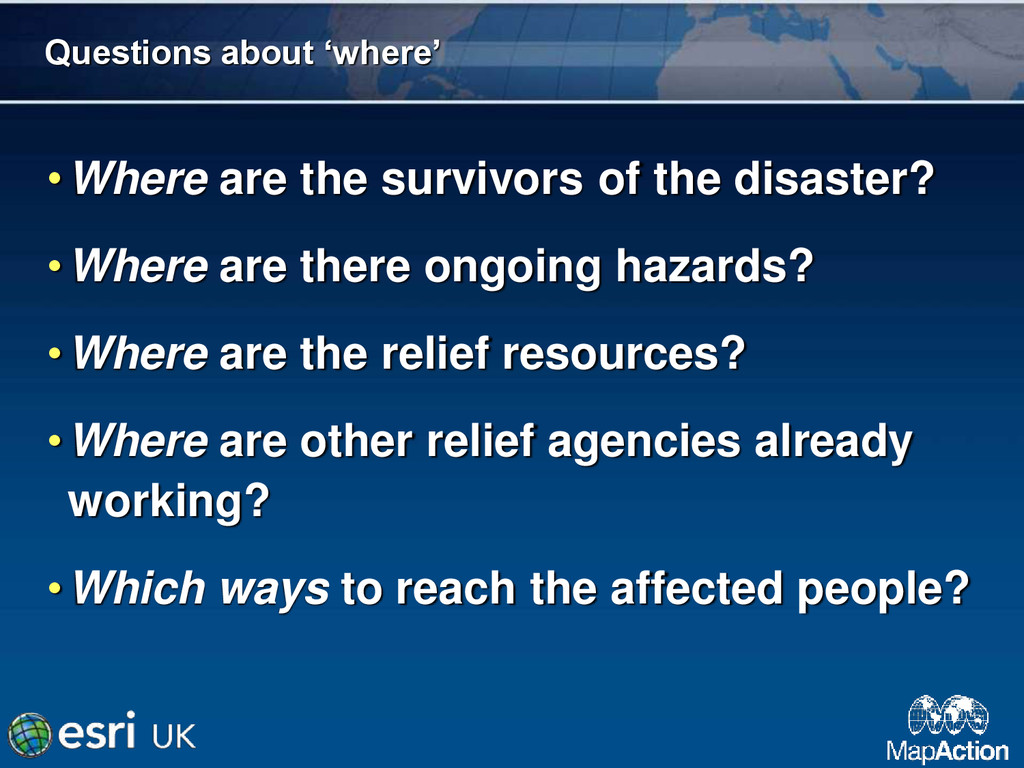 •Where are there ongoing hazards? •Where are the relief resources? •Where are other relief agencies already working? •Which ways to reach the affected people?