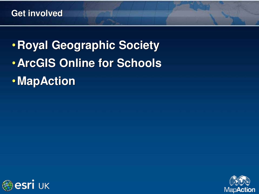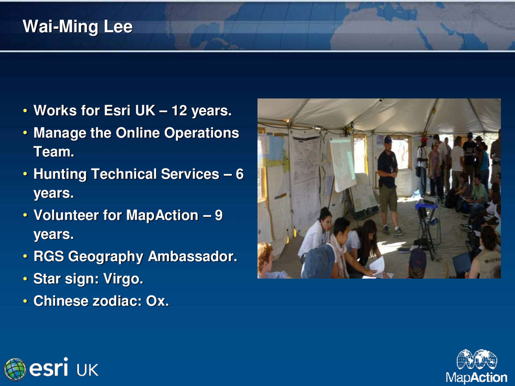 • Manage the Online Operations Team. • Hunting Technical Services – 6 years. • Volunteer for MapAction – 9 years. • RGS Geography Ambassador. • Star sign: Virgo. • Chinese zodiac: Ox.