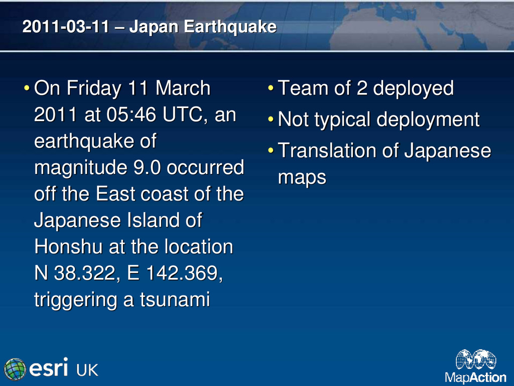 at 05:46 UTC, an earthquake of magnitude 9.0 occurred off the East coast of the Japanese Island of Honshu at the location N 38.322, E 142.369, triggering a tsunami • Team of 2 deployed • Not typical deployment • Translation of Japanese maps