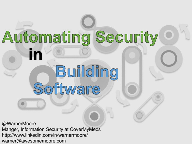 Everyone’s concerned about security from your peers to your board, but what does that mean to building software? This presentation will explore techniques for embedding security into your Software Development Lifecycle using automation and aligning to your existing practices for building software. Better yet, many of these automation techniques align to DevOps culture and practices. Building secure software doesn’t mean slowing down delivery or adding meaningless paperwork – it can complement your favorite ways to build software! Presentation given to AllDayDevOps 11/15/2016 (Video: https://youtu.be/54g3Sc3rRZk), CodeMash 1/13/2017, Security BSides 1/16/2017 (Video: https://www.youtube.com/watch?v=UM3Dm-TrFZg&feature=youtu.be), ScaleTech 1/17/2017 (Video: https://www.youtube.com/watch?v=R4ZuhmEuZ60), and Nationwide Insurance's TechCon 2/21/2017.