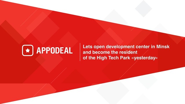 HTP resident «yesterday» Lets open development center in Minsk and become the resident of the HighTechPark «yesterday» Ruslan Voronetsky General Manager / Appodeal BEFORE Was in charge of business development efforts and corporate services in Colliers International NOW General manager of Appodeal Belarus, operating business processes in CIS region