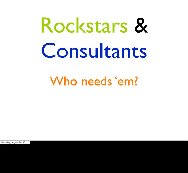 In this session we’ll explore ways in which the average development team can explore, learn, teach, and grow, until the sum of members of the team is as great as any Consultant or Rockstar.