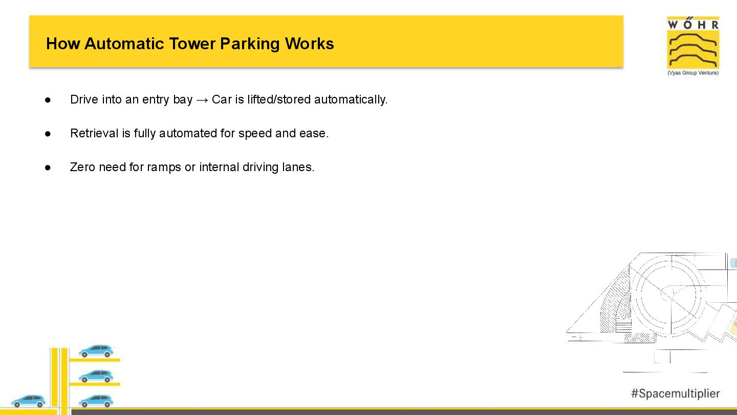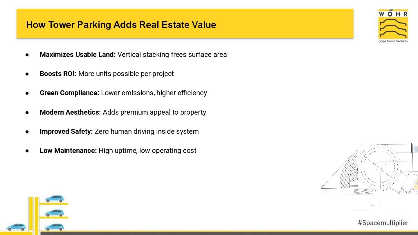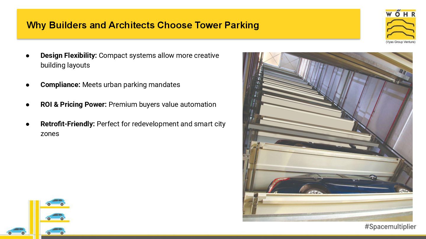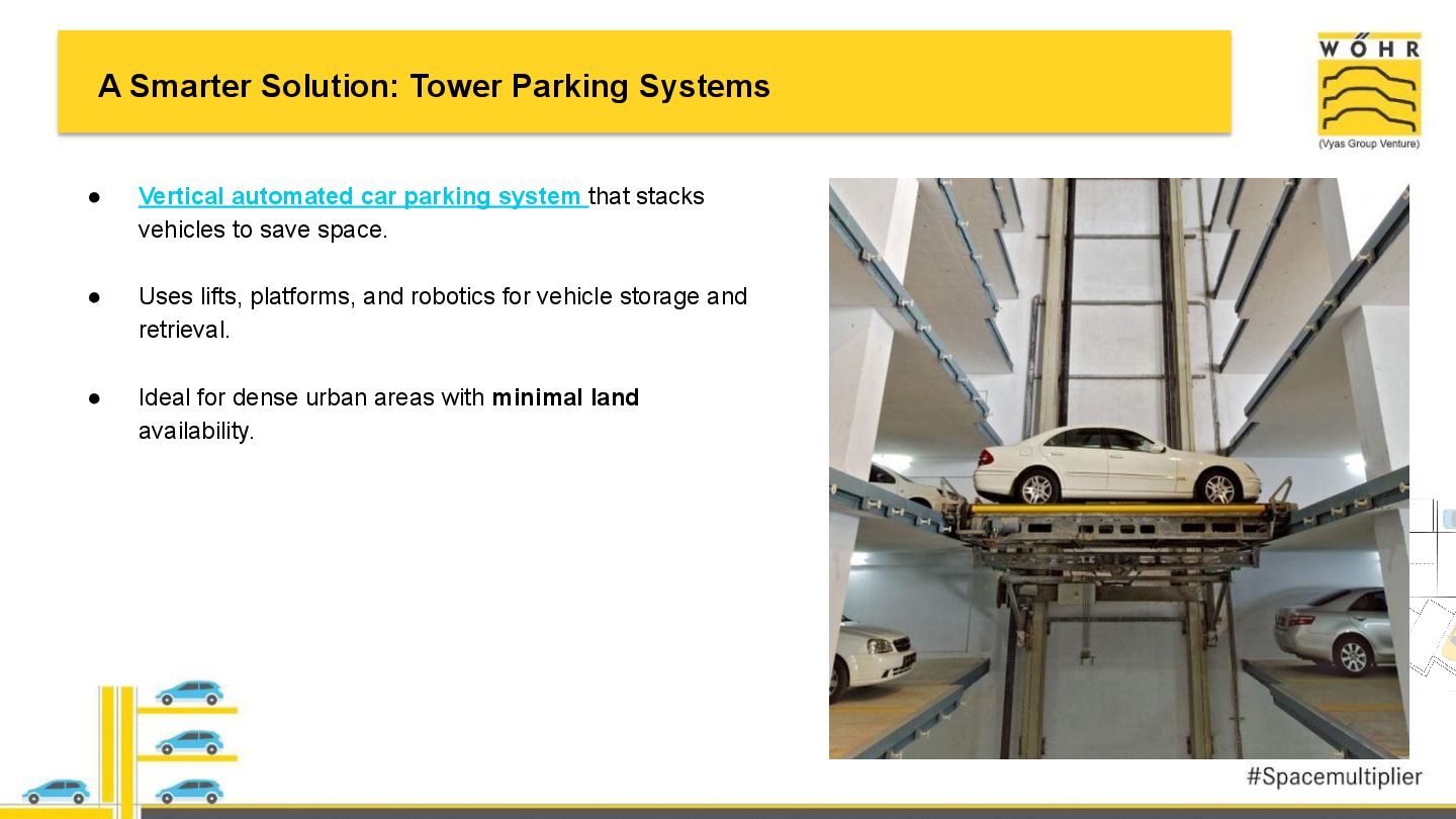 Tower parking is a vertical, automated car parking system that uses the concept of stacking to park cars in multiple levels above or below ground. Instead of spreading parking space horizontally, tower car parking optimizes vertical real estate, significantly increasing capacity in a smaller footprint.