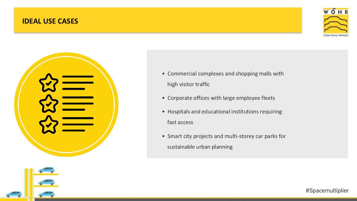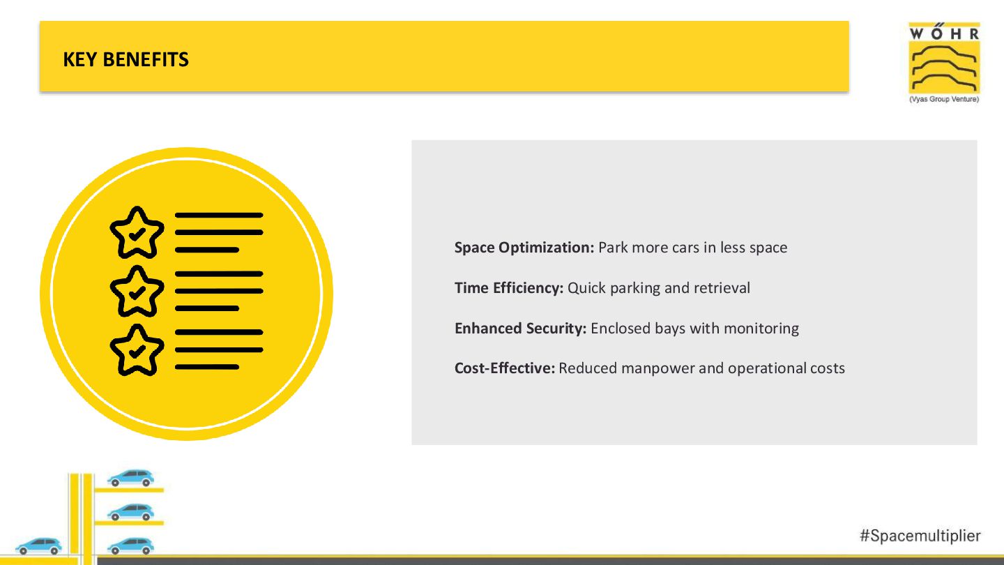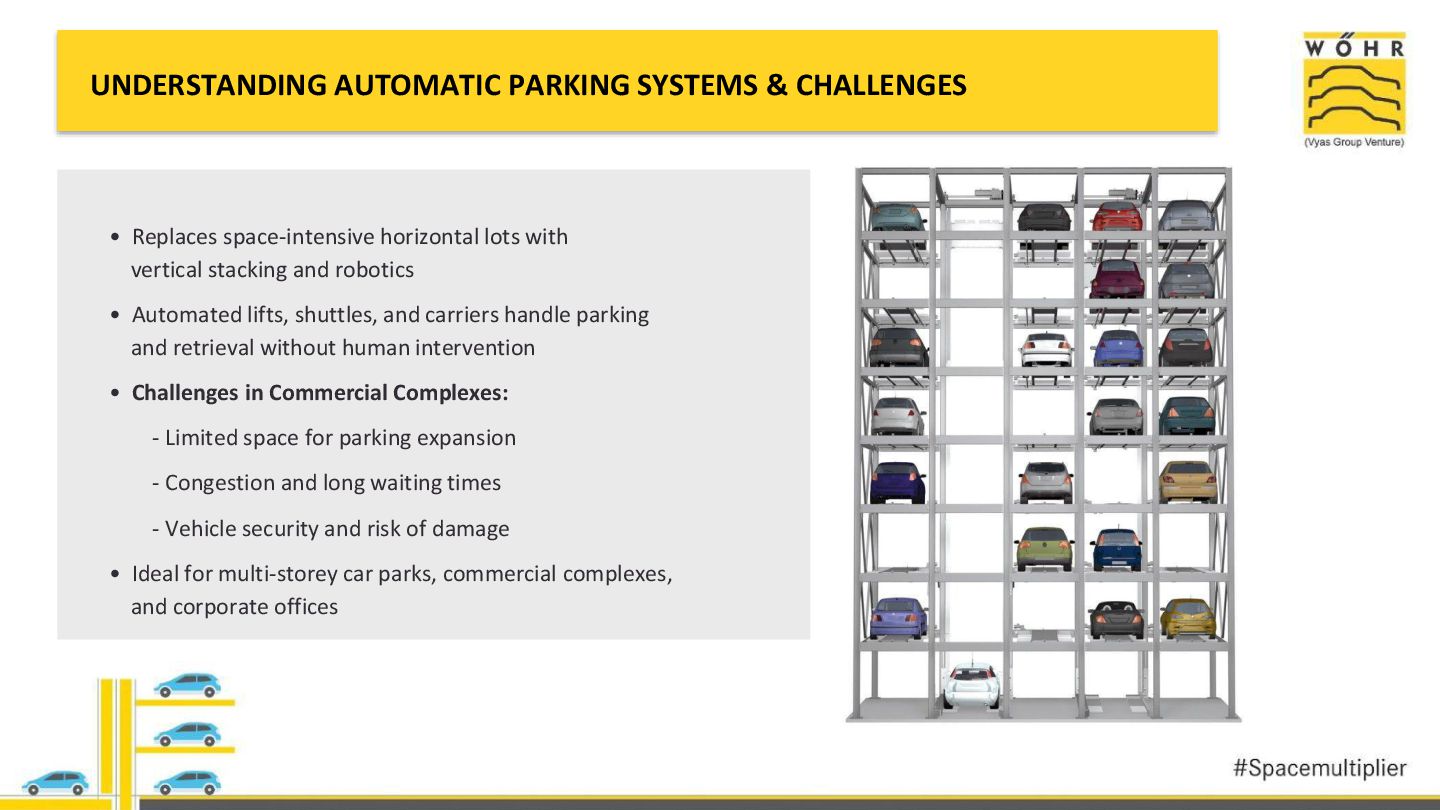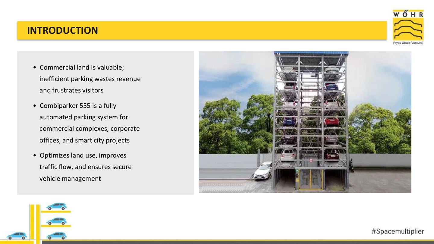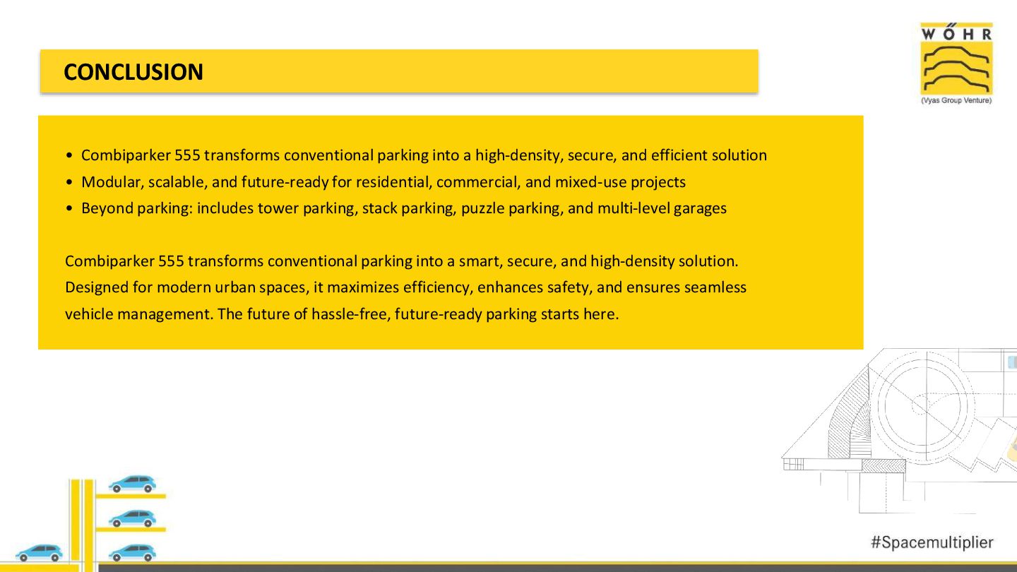 WOHR’s Combiparker 555 redefines parking in commercial complexes by addressing space limitations, congestion, delays, and safety concerns. Through advanced vertical and horizontal stacking, combined with robotic automation, it ensures fast vehicle retrieval, secure access, and optimal land use. The system delivers benefits such as eco-friendly operations, reduced emissions, lower operational costs, and seamless integration with smart technologies. Ideal for malls, corporate offices, hospitals, smart city projects, multi-storey car parks, and luxury developments, the Combiparker 555 provides a future-ready parking solution that enhances property value, improves traffic flow, and transforms the overall user experience in urban environments.