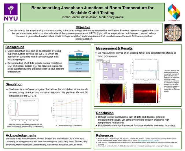 the time, energy, and money required for verification. Previous research suggests that room temperature characteristics can be indicative of the quantum properties of JJFETs (right) at low temperatures. In this project, we aim to help construct a generalized mathematical model through simulation and measurement that would eliminate the need for low-temperature characterization. References • Mayer, W., Yuan, J., Wickramsinghe, K.S., Nguyen, T., Dartiailh, M.C., Shabani, J. (2019). Superconducting proximity effect in epitaxial Al-InAs heterostructures. Applied Physics Letters, 114(10), 103-104, http://dx.doi.org/10.1063/1.5067363. • Yuan, J. (2021). Epitaxial superconductor-semiconductor two-dimensional systems: a new platform for quantum computation, New York University. • Almanakly, A., Lendino, M., Kohli, A. (2020). Development of InAs transistors for scalable quantum computing, The Cooper Union. Benchmarking Josephson Junctions at Room Temperature for Scalable Qubit Testing Tamar Bacalu, Alexa Jakob, Mark Koszykowski Simulation Measurement & Results Background • Qubits (quantum bits) can be constructed by using superconducting devices like JJFETs, which are Josephson Junctions with a semiconductor in its insulating region • Key properties of JJFETs include normal resistance (R N ) and critical current (I C ). We focus on resistance since superconducting properties don’t occur at room temperature Electron density and energy levels across stack, including quantum well (1D simulation) IV Characteristics (2D simulation) • We measured IV curves of an existing JJFET and calculated resistance at room temperature • Nextnano is a software program that allows for simulation of nanoscale devices using quantum and classical methods. We perform 1D and 2D simulations of the JJFETs. Acknowledgements We would like to thank Professor Neveen Shlayan and the Shabani Lab at New York University for being generous with their time and space, particularly Javad Shabani, Billy Strickland, Mehdi Hatefipour, Zhujun Huang, Mohammad Farzaneh, and Joe Yuan. Clockwise, from top left: Measurement setup to sweep both source and gate; instrumentation resistance as measured; JS127A cryogenic resistance as a function of current bias and gate voltage; JS129A upper bound device resistance as a function of gate voltage and source-drain voltage Conclusion • Difficult to draw conclusions: lack of data and devices, different measurement setups, yet some evidence to support cryogenic-high temperature relationship • Provided documented framework for future students interested in project