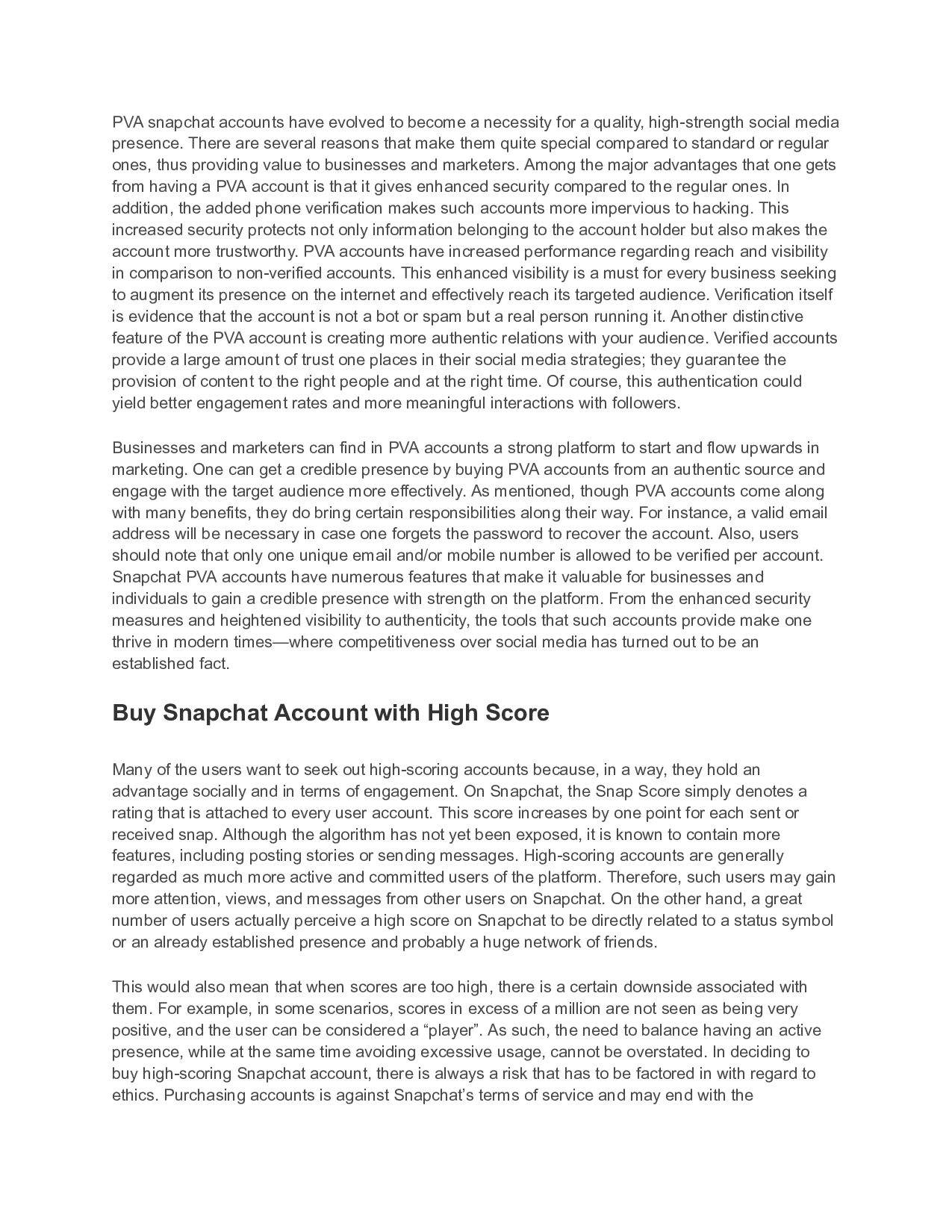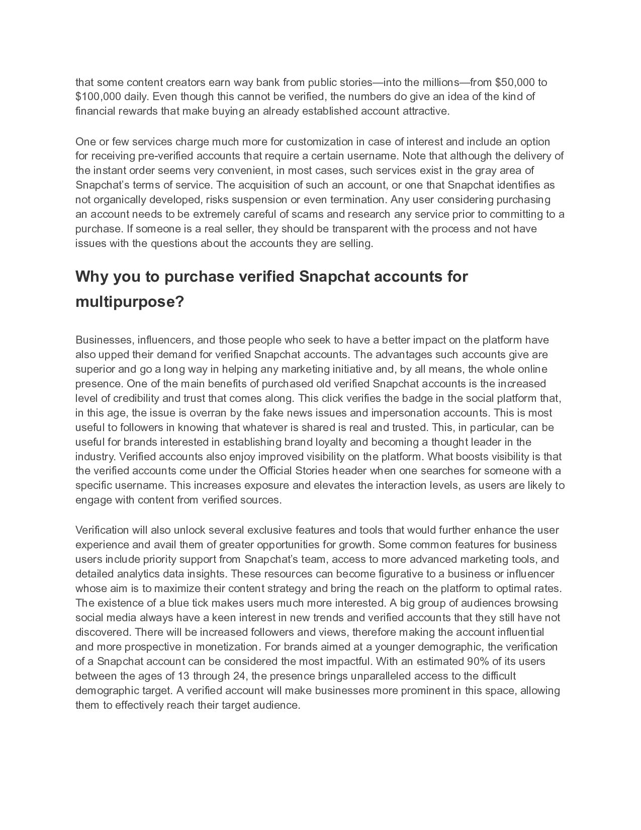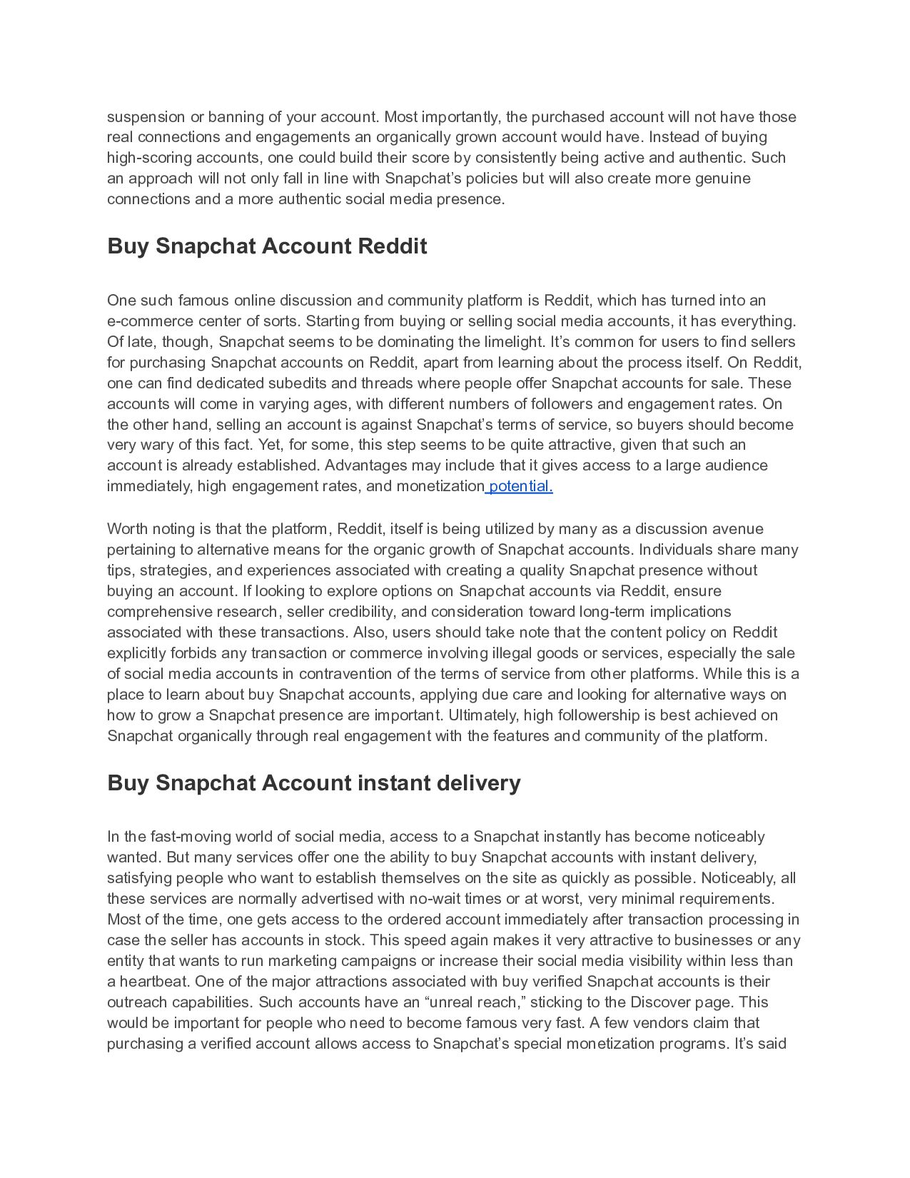 account will not have those real connections and engagements an organically grown account would have. Instead of buying high-scoring accounts, one could build their score by consistently being active and authentic. Such an approach will not only fall in line with Snapchat’s policies but will also create more genuine connections and a more authentic social media presence. Buy Snapchat Account Reddit One such famous online discussion and community platform is Reddit, which has turned into an e-commerce center of sorts. Starting from buying or selling social media accounts, it has everything. Of late, though, Snapchat seems to be dominating the limelight. It’s common for users to find sellers for purchasing Snapchat accounts on Reddit, apart from learning about the process itself. On Reddit, one can find dedicated subedits and threads where people offer Snapchat accounts for sale. These accounts will come in varying ages, with different numbers of followers and engagement rates. On the other hand, selling an account is against Snapchat’s terms of service, so buyers should become very wary of this fact. Yet, for some, this step seems to be quite attractive, given that such an account is already established. Advantages may include that it gives access to a large audience immediately, high engagement rates, and monetization potential. Worth noting is that the platform, Reddit, itself is being utilized by many as a discussion avenue pertaining to alternative means for the organic growth of Snapchat accounts. Individuals share many tips, strategies, and experiences associated with creating a quality Snapchat presence without buying an account. If looking to explore options on Snapchat accounts via Reddit, ensure comprehensive research, seller credibility, and consideration toward long-term implications associated with these transactions. Also, users should take note that the content policy on Reddit explicitly forbids any transaction or commerce involving illegal goods or services, especially the sale of social media accounts in contravention of the terms of service from other platforms. While this is a place to learn about buy Snapchat accounts, applying due care and looking for alternative ways on how to grow a Snapchat presence are important. Ultimately, high followership is best achieved on Snapchat organically through real engagement with the features and community of the platform. Buy Snapchat Account instant delivery In the fast-moving world of social media, access to a Snapchat instantly has become noticeably wanted. But many services offer one the ability to buy Snapchat accounts with instant delivery, satisfying people who want to establish themselves on the site as quickly as possible. Noticeably, all these services are normally advertised with no-wait times or at worst, very minimal requirements. Most of the time, one gets access to the ordered account immediately after transaction processing in case the seller has accounts in stock. This speed again makes it very attractive to businesses or any entity that wants to run marketing campaigns or increase their social media visibility within less than a heartbeat. One of the major attractions associated with buy verified Snapchat accounts is their outreach capabilities. Such accounts have an “unreal reach,” sticking to the Discover page. This would be important for people who need to become famous very fast. A few vendors claim that purchasing a verified account allows access to Snapchat’s special monetization programs. It’s said