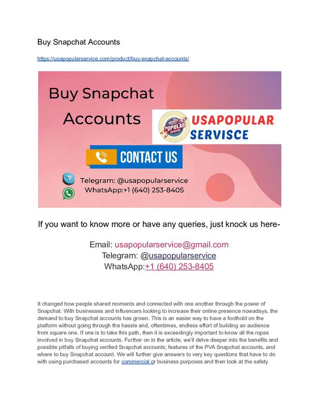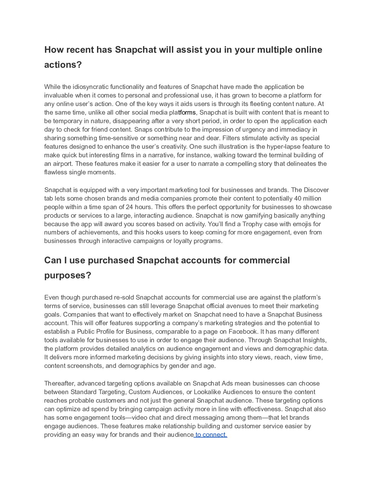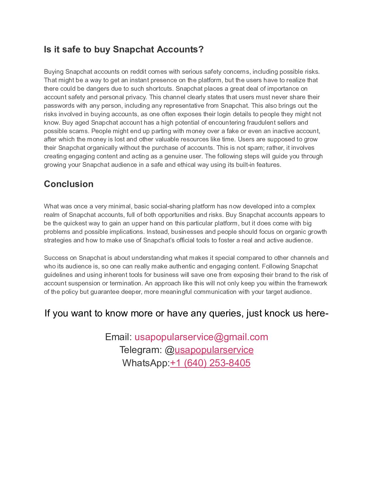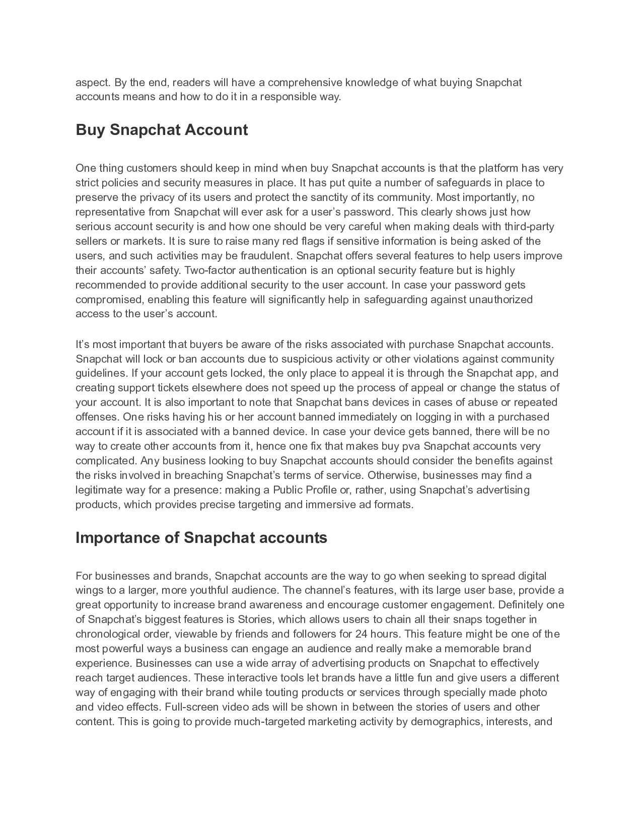 account will not have those real connections and engagements an organically grown account would have. Instead of buying high-scoring accounts, one could build their score by consistently being active and authentic. Such an approach will not only fall in line with Snapchat’s policies but will also create more genuine connections and a more authentic social media presence. Buy Snapchat Account Reddit One such famous online discussion and community platform is Reddit, which has turned into an e-commerce center of sorts. Starting from buying or selling social media accounts, it has everything. Of late, though, Snapchat seems to be dominating the limelight. It’s common for users to find sellers for purchasing Snapchat accounts on Reddit, apart from learning about the process itself. On Reddit, one can find dedicated subedits and threads where people offer Snapchat accounts for sale. These accounts will come in varying ages, with different numbers of followers and engagement rates. On the other hand, selling an account is against Snapchat’s terms of service, so buyers should become very wary of this fact. Yet, for some, this step seems to be quite attractive, given that such an account is already established. Advantages may include that it gives access to a large audience immediately, high engagement rates, and monetization potential. Worth noting is that the platform, Reddit, itself is being utilized by many as a discussion avenue pertaining to alternative means for the organic growth of Snapchat accounts. Individuals share many tips, strategies, and experiences associated with creating a quality Snapchat presence without buying an account. If looking to explore options on Snapchat accounts via Reddit, ensure comprehensive research, seller credibility, and consideration toward long-term implications associated with these transactions. Also, users should take note that the content policy on Reddit explicitly forbids any transaction or commerce involving illegal goods or services, especially the sale of social media accounts in contravention of the terms of service from other platforms. While this is a place to learn about buy Snapchat accounts, applying due care and looking for alternative ways on how to grow a Snapchat presence are important. Ultimately, high followership is best achieved on Snapchat organically through real engagement with the features and community of the platform. Buy Snapchat Account instant delivery In the fast-moving world of social media, access to a Snapchat instantly has become noticeably wanted. But many services offer one the ability to buy Snapchat accounts with instant delivery, satisfying people who want to establish themselves on the site as quickly as possible. Noticeably, all these services are normally advertised with no-wait times or at worst, very minimal requirements. Most of the time, one gets access to the ordered account immediately after transaction processing in case the seller has accounts in stock. This speed again makes it very attractive to businesses or any entity that wants to run marketing campaigns or increase their social media visibility within less than a heartbeat. One of the major attractions associated with buy verified Snapchat accounts is their outreach capabilities. Such accounts have an “unreal reach,” sticking to the Discover page. This would be important for people who need to become famous very fast. A few vendors claim that purchasing a verified account allows access to Snapchat’s special monetization programs. It’s said