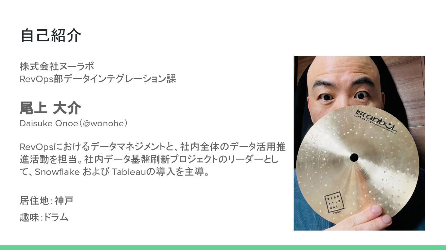 自己紹介 株式会社ヌーラボ RevOps部データインテグレーション課 尾上 大介 Daisuke Onoe(@wonohe) RevOpsにおけるデータマネジメントと、社内全体のデータ活用推 進活動を担当。社内データ基盤刷新プロジェクトのリーダーとし て、Snowflake