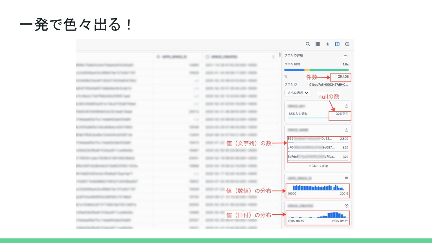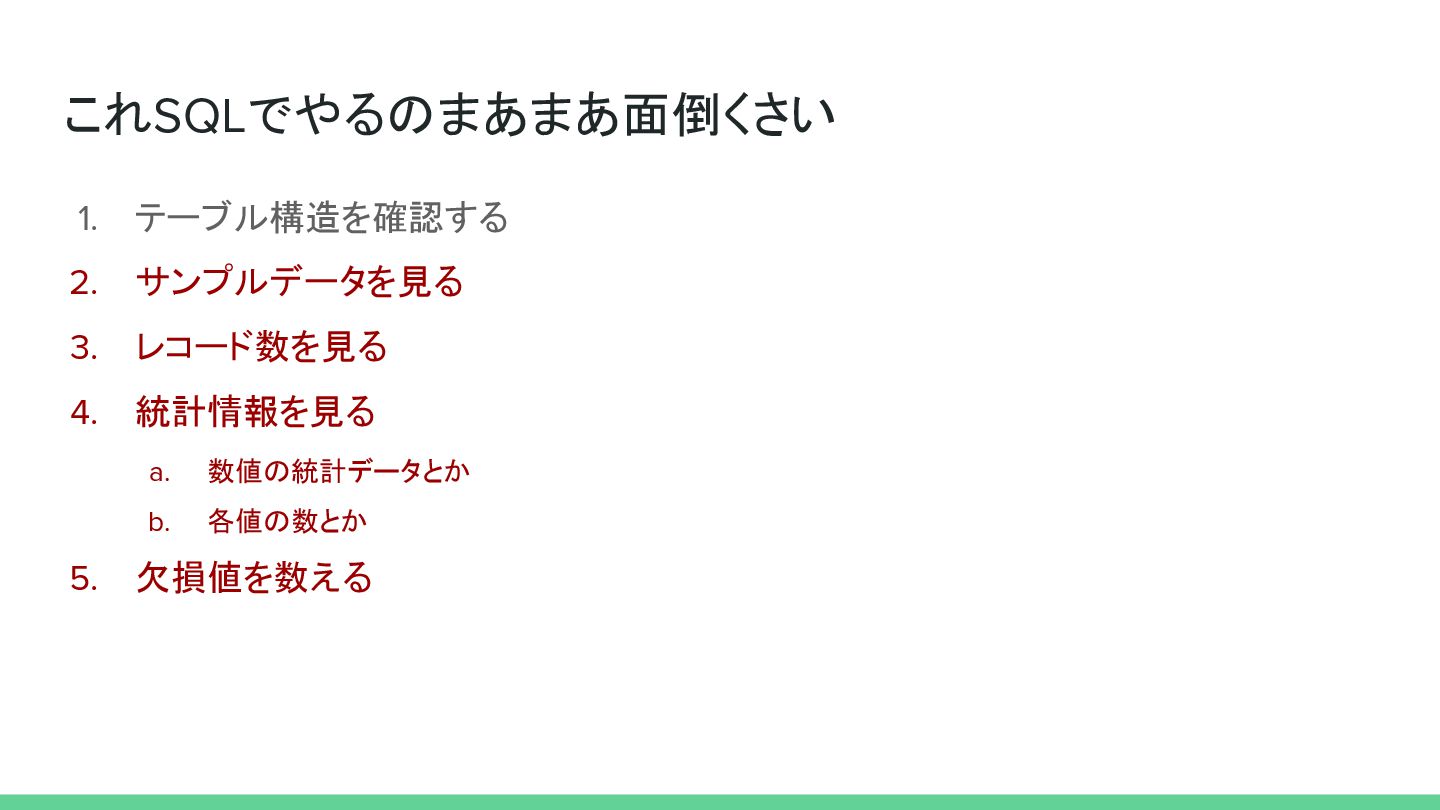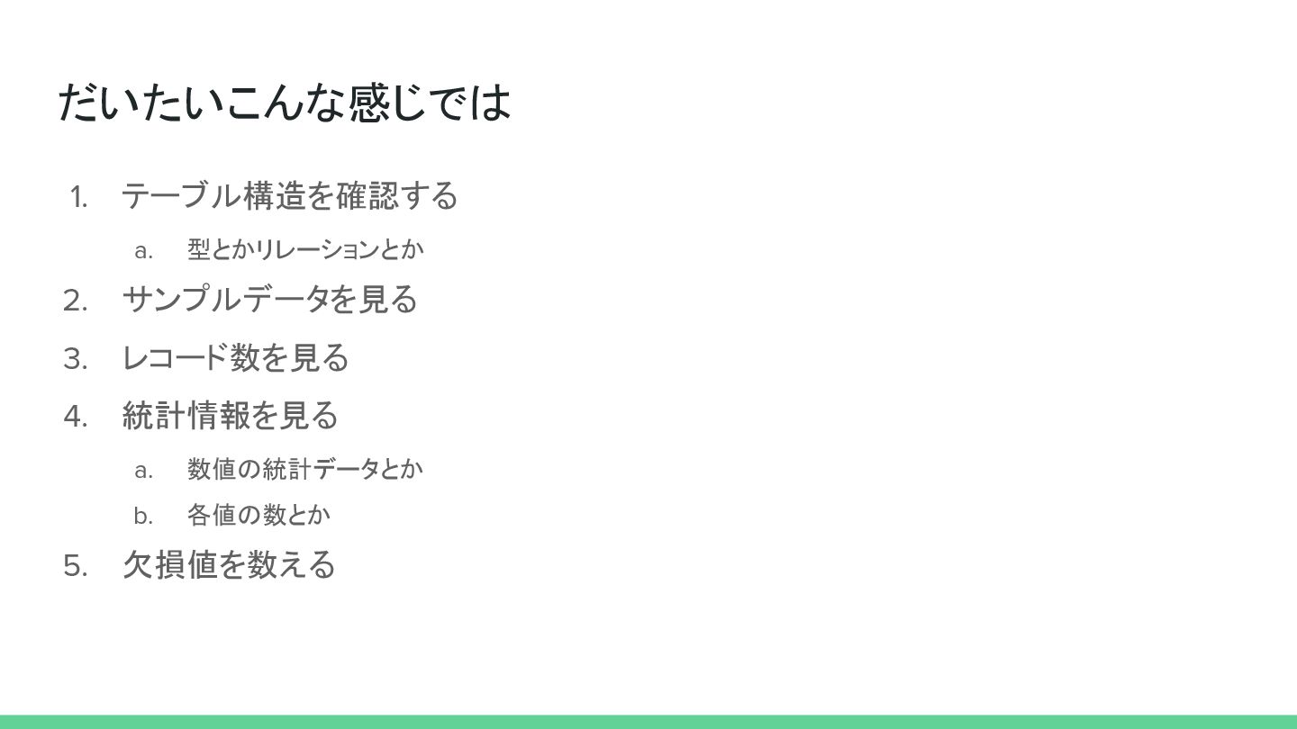 これSQLでやるのまあまあ面倒くさい 1. テーブル構造を確認する 2. サンプルデータを見る 3. レコード数を見る 4. 統計情報を見る a.