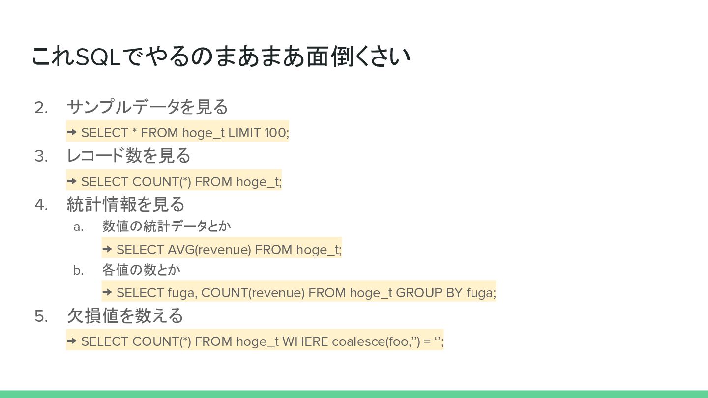 3. レコード数を見る → SELECT COUNT(*) FROM hoge_t; 4. 統計情報を見る a. 数値の統計データとか → SELECT AVG(revenue) FROM hoge_t; b. 各値の数とか → SELECT fuga, COUNT(revenue) FROM hoge_t GROUP BY fuga; 5. 欠損値を数える → SELECT COUNT(*) FROM hoge_t WHERE coalesce(foo,’’) = ‘’;