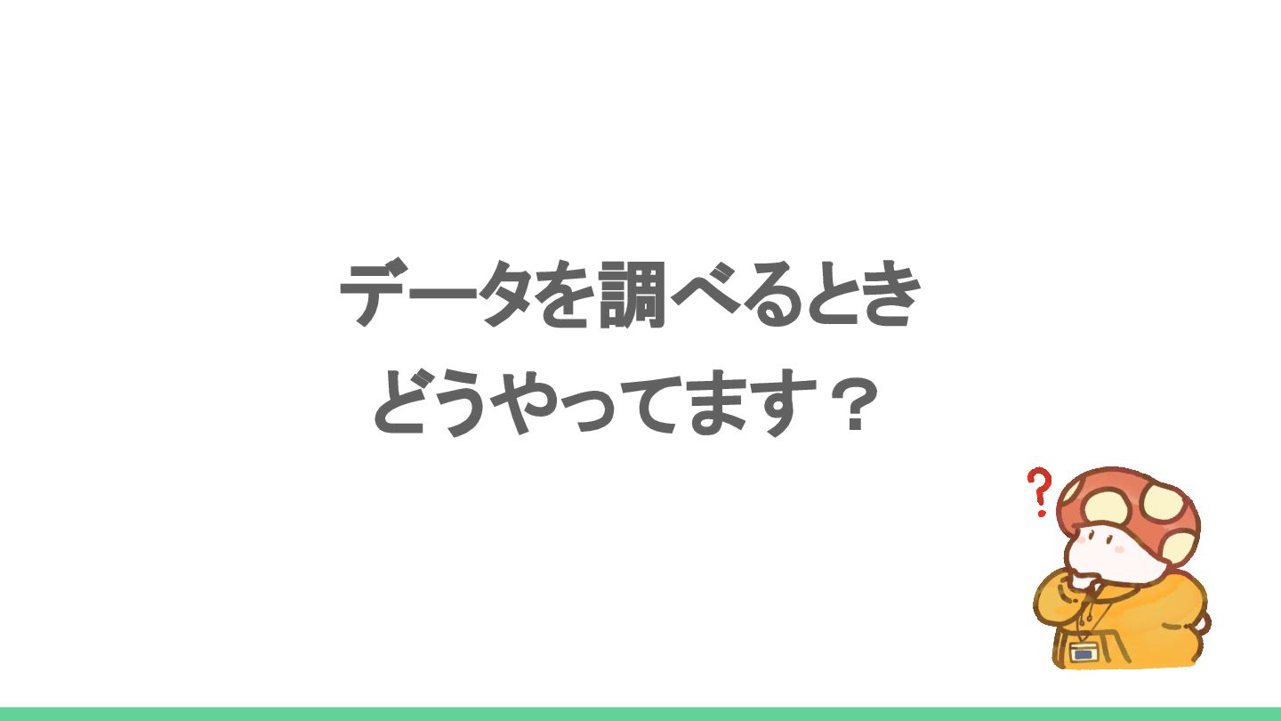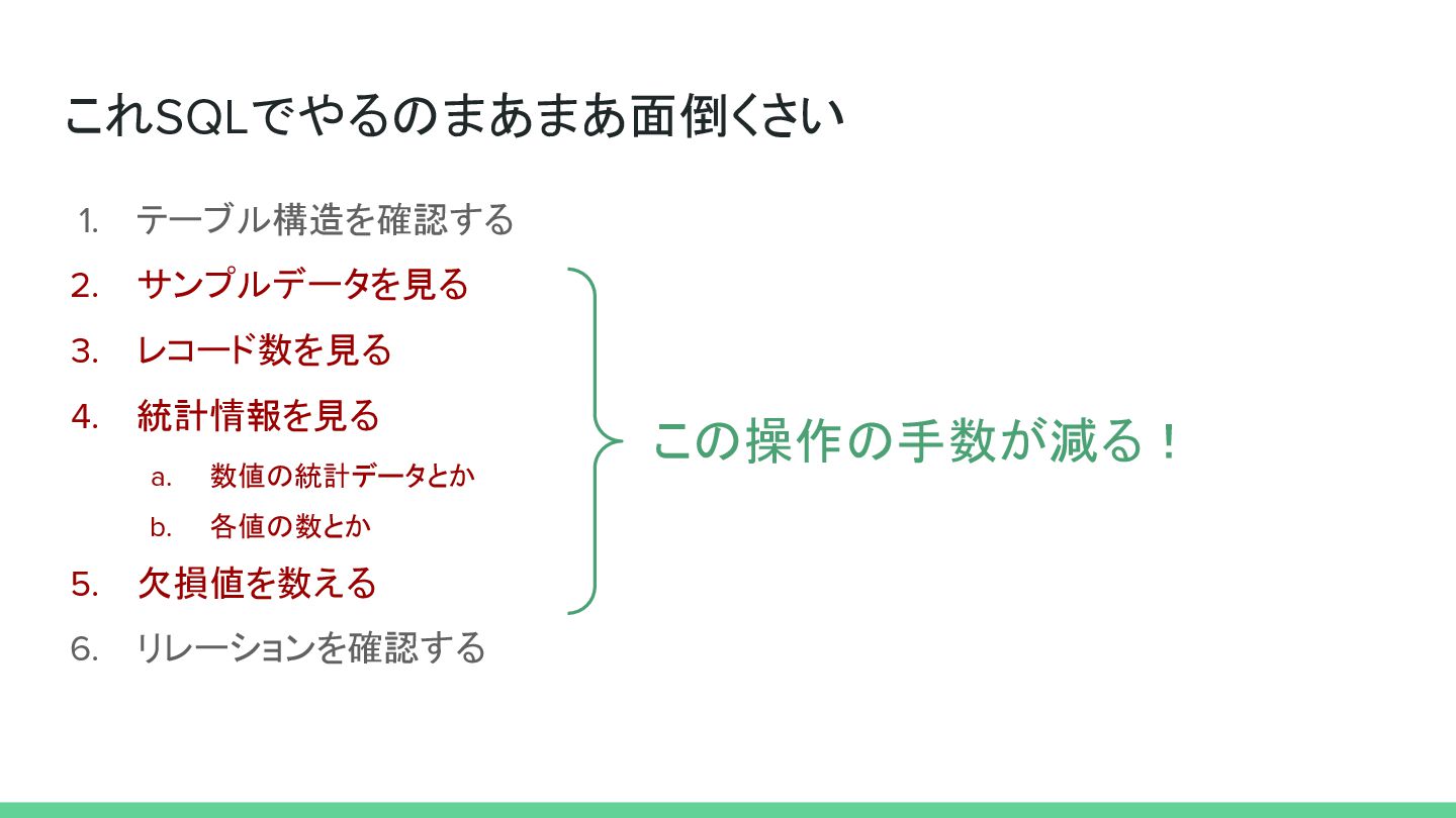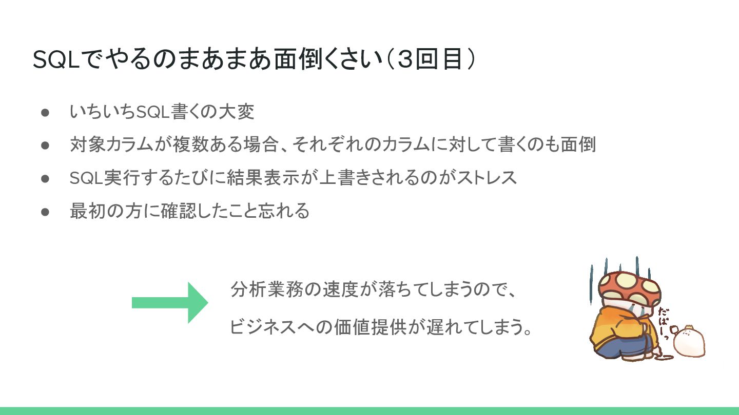 SQLでやるのまあまあ面倒くさい(3回目) • いちいちSQL書くの大変 • 対象カラムが複数ある場合、それぞれのカラムに対して書くのも面倒 • SQL実行するたびに結果表示が上書きされるのがストレス • 最初の方に確認したこと忘れる 分析業務の速度が落ちてしまうので、