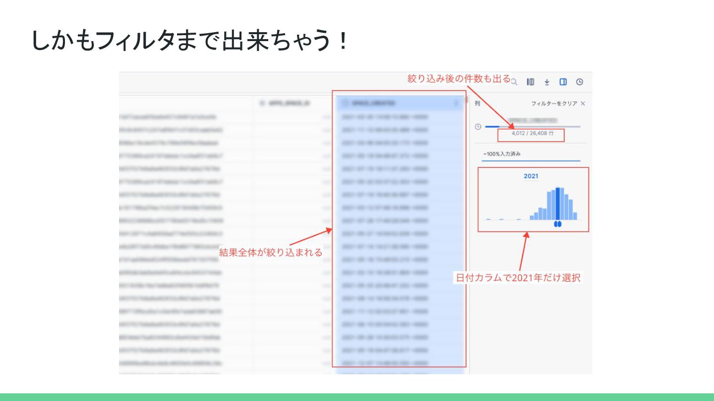 SQLでやるのまあまあ面倒くさい(2回目) • いちいちSQL書くの大変 • 対象カラムが複数ある場合、それぞれのカラムに対して書くのも面倒 • SQL実行するたびに結果表示が上書きされるのがストレス • 最初の方に確認したこと忘れる