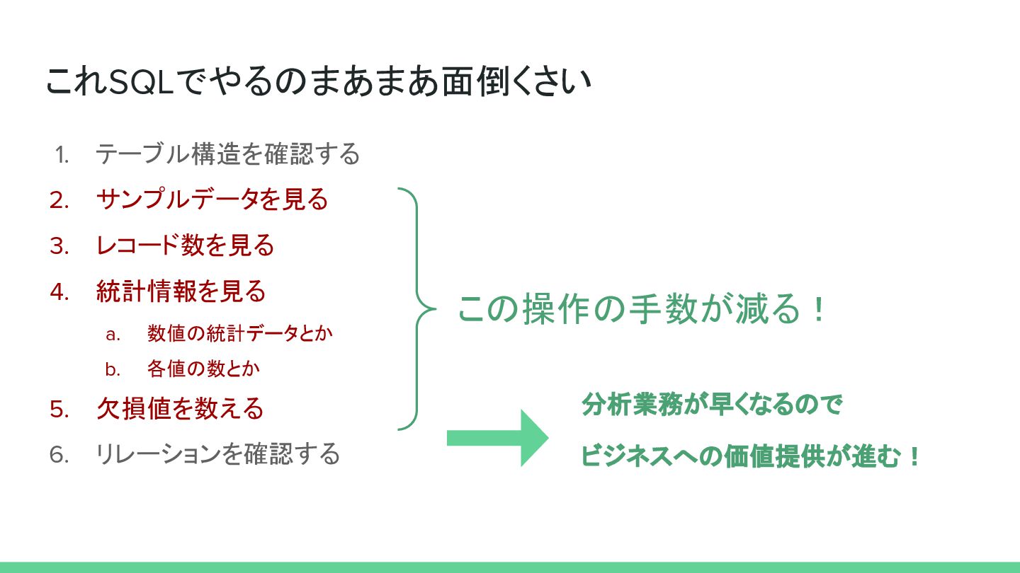 数値の統計データとか b. 各値の数とか 5. 欠損値を数える 6. リレーションを確認する この操作の手数が減る! 分析業務が早くなるので ビジネスへの価値提供が進む!