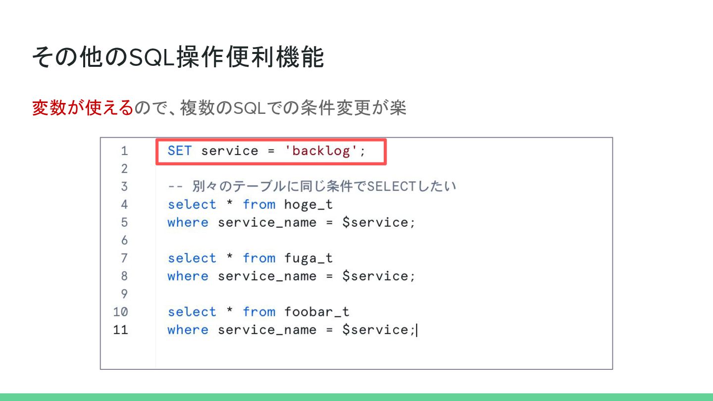 その他のSQL操作便利機能 変数が使えるので、複数のSQLでの条件変更が楽