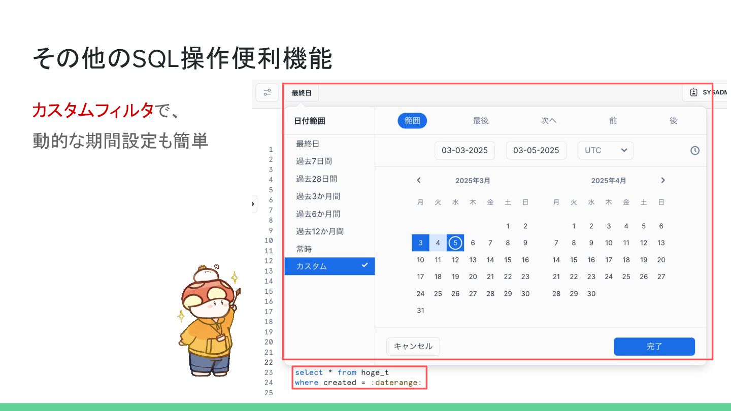 その他のSQL操作便利機能 カスタムフィルタで、 動的な期間設定も簡単