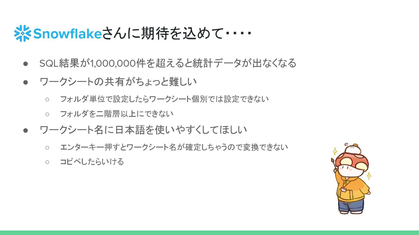 Snowflakeさんに期待を込めて・・・・ • SQL結果が1,000,000件を超えると統計データが出なくなる • ワークシートの共有がちょっと難しい ◦ フォルダ単位で設定したらワークシート個別では設定できない ◦ フォルダを二階層以上にできない •