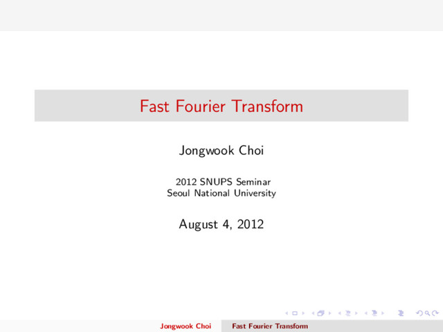 · · · + an−1xn−1 을 생각하자. ω ∈ C 을 primitive root of unity (ωn = 1 라는 말) 라고 할 때, n개의 점 ω0, ω1, ω2, · · · , ωn−1 에서의 함수값 A(ωi) = n−1 j=0 aj(ωi)j 들을 모으면 n 개의 수가 얻어진다. 이 때 transform Cn → Cn (a0, a1, · · · , an−1) → (A(a0), A(a1), · · · , A(an−1)) 를 DFT (이산 푸리에 변환) 이라고 한다. Jongwook Choi Fast Fourier Transform