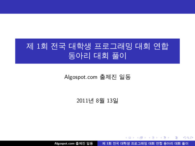 한번더 주장해보시지 <LIBe> 새벽에 20대 후반의 한 남자를 울며 잠들게 한 문제 <JM> 나 다시는 빙꺼 검수안해 <astein> 저 G 한번에 맞았음 > . < <astein> 짜증나 죽는 줄 알았음.. 1(출제자가 주장했던) Topcoder SRM Div1 기준 난이도 Algospot.com 출제진 일동 제 1회 전국 대학생 프로그래밍 대회 연합 동아리 대회 풀이