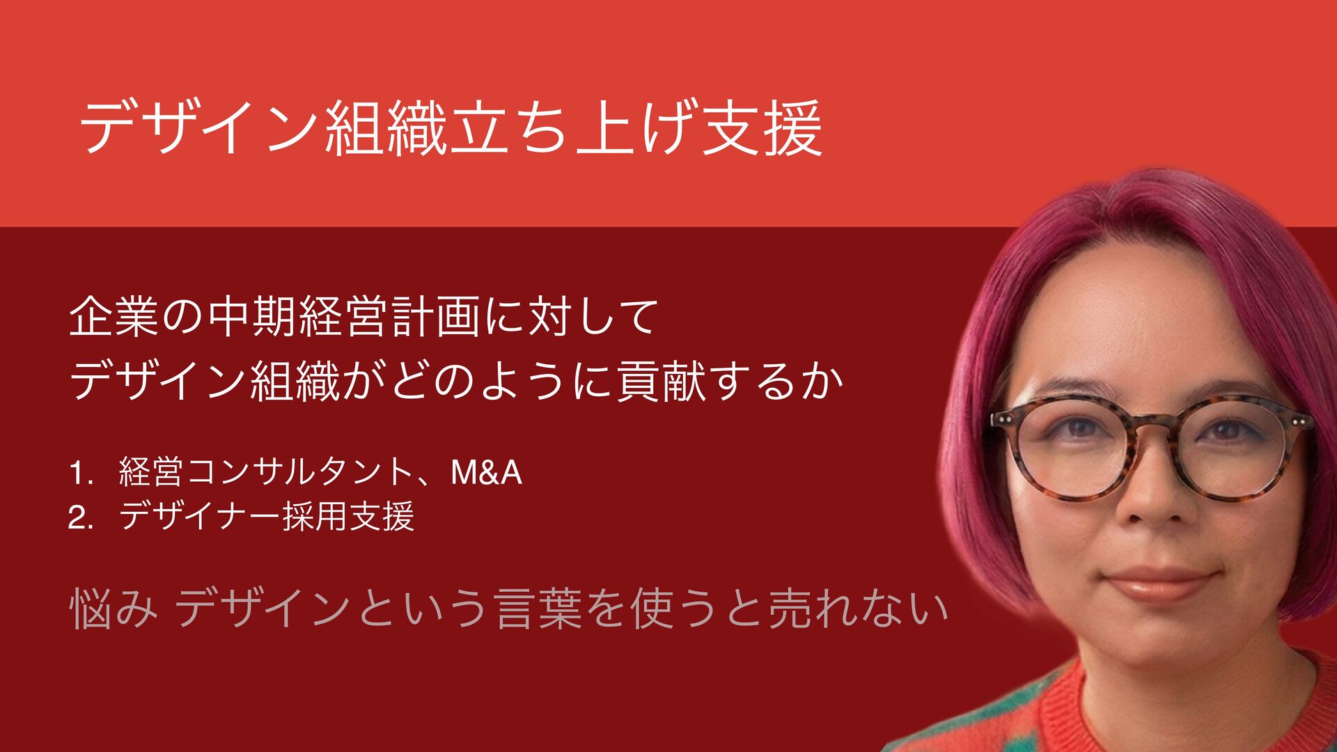 と、言うのも、わたしはデザインプレイングではなく、これまでマネーフォワードやSmartHRでDPMをしてきた経験をもとに、デザイン組織の立ち上げ支援や、企業の経営計画にデザインをどう組み込むかのコンサルティングを行っているからです。AIによるデザインプレイングではなく戦略を練ったり事業を作ったりしています。その時、デザインっていうと経営者に届かないというのが現在の悩みですね。わざわざリーチを狭めて売る意味はあるのでしょうか。