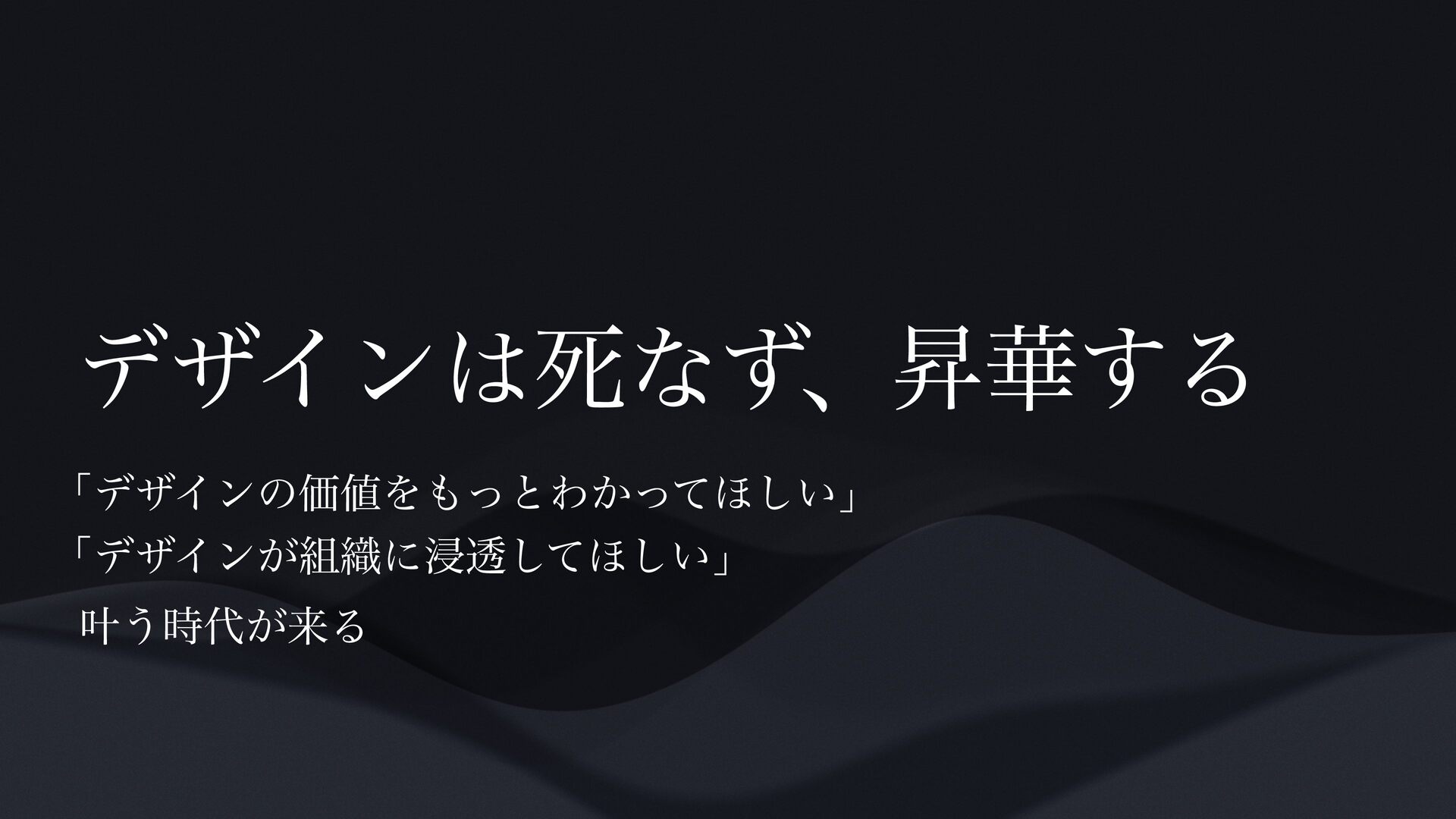 全人類がデザインできるようになる。デザインシンクロニシティと言えるんじゃないでしょうか。私たちはずっと言ってきました。「デザインの価値をもっとわかってほしい」「デザインが組織に浸透してほしい」。それが叶う時代が来ようとしています。デザインが死ぬというより、それは昇華の方が正しいかもしれません。でもこれは不可逆でしょうね。そして変化した方が楽しくなるとも思います。本当に怖いコトですか?