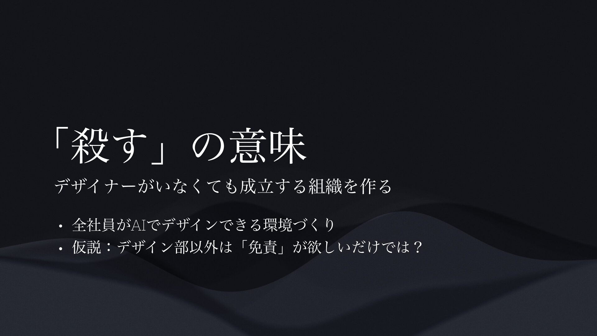 私がやっているのは、デザイナーがいなくても成立する組織を作ること。DesignOpsとして、デザインを組織に溶かす。デザイナーの椅子を自分の手で取り除いてみる。組織にデザイナーがいることと、組織的にデザインできることは似ているけど違います。デザイナーが0人になっても組織に残っているデザインとはなんでしょう? デザインシステムを整備して、ブランドガイドラインを引いて、最終的には全社員がデザイナーになるためにAIをどう使うかなどでしょうか。わたしの顧客へのヒアリングの結果、デザイン関連の意思決定についてデザイン部以外は免責が欲しいのではという仮説があります。生成AIが出力したものにGOを出すのは自分以外がいい。それで足りてしまう組織にはデザイナーが不要になるでしょう。