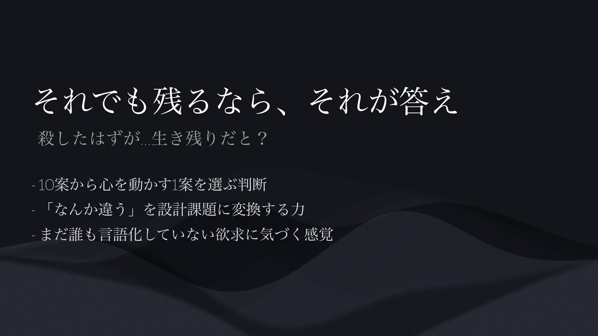 あらためて問いましょう。みなさんは消えゆくとされるデザインをわざわざ携えて、何を成したいですか? その問いに答え続けることを今日からはじめてみましょう。デザインが死ぬなら、せめてあなたはどうやって殺したいですか?
