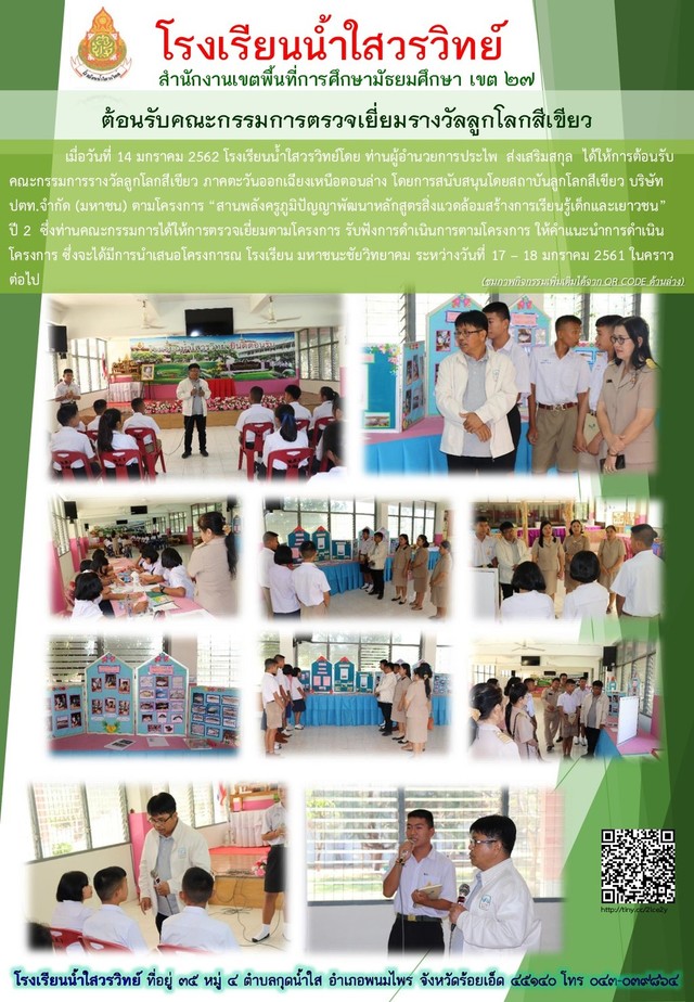 มกราคม 2562 โรงเรียนน ้าใสวรวิทย์โดย ท่านผู้อ้านวยการประไพ ส่งเสริมสกุล ได้ให้การต้อนรับ คณะกรรมการรางวัลลูกโลกสีเขียว ภาคตะวันออกเฉียงเหนือตอนล่าง โดยการสนับสนุนโดยสถาบันลูกโลกสีเขียว บริษัท ปตท.จ้ากัด (มหาชน) ตามโครงการ “สานพลังครูภูมิปัญญาพัฒนาหลักสูตรสิ่งแวดล้อมสร้างการเรียนรู้เด็กและเยาวชน” ปี 2 ซึ่งท่านคณะกรรมการได้ให้การตรวจเยี่ยมตามโครงการ รับฟังการด้าเนินการตามโครงการ ให้ค้าแนะน้าการด้าเนิน โครงการ ซึ่งจะได้มีการน้าเสนอโครงการณ โรงเรียน มหาชนะชัยวิทยาคม ระหว่างวันที่ 17 – 18 มกราคม 2561 ในคราว ต่อไป (ชมภาพกิจกรรมเพิ่มเติมได้จาก QR CODE ด้านล่าง)