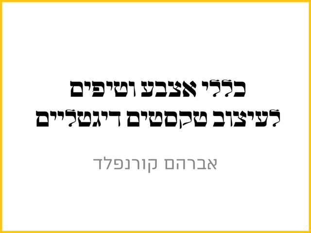 כל מה שרציתם/ן לדעת על טיפוגרפיה דיגיטלית ולא העזתם לשאול. בהרצאה זו אחזור לבסיס של העיצוב והטיפוגרפיה עם כמה כללי אצבע לעיצוב טקסטים דיגטליים וטיפים לשדרוג העיצוב של אתרי הוורדפרס שלכם. אדבר על מושגי מפתח בטיפוגרפיה עברית שכל מעצב/מתכנת ישמח להכיר: קרנינג, טרקינג, לדינג, ניקוד, רינדורי טקסט, שילובי פונטים ומשקלים, סריפים, היררכיה, מחוללי טקסט וטכניקות מיוחדות לעיצוב אתרי וורדפרס בקוד סמנטי.