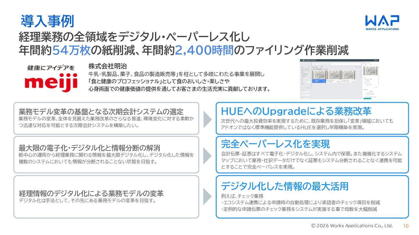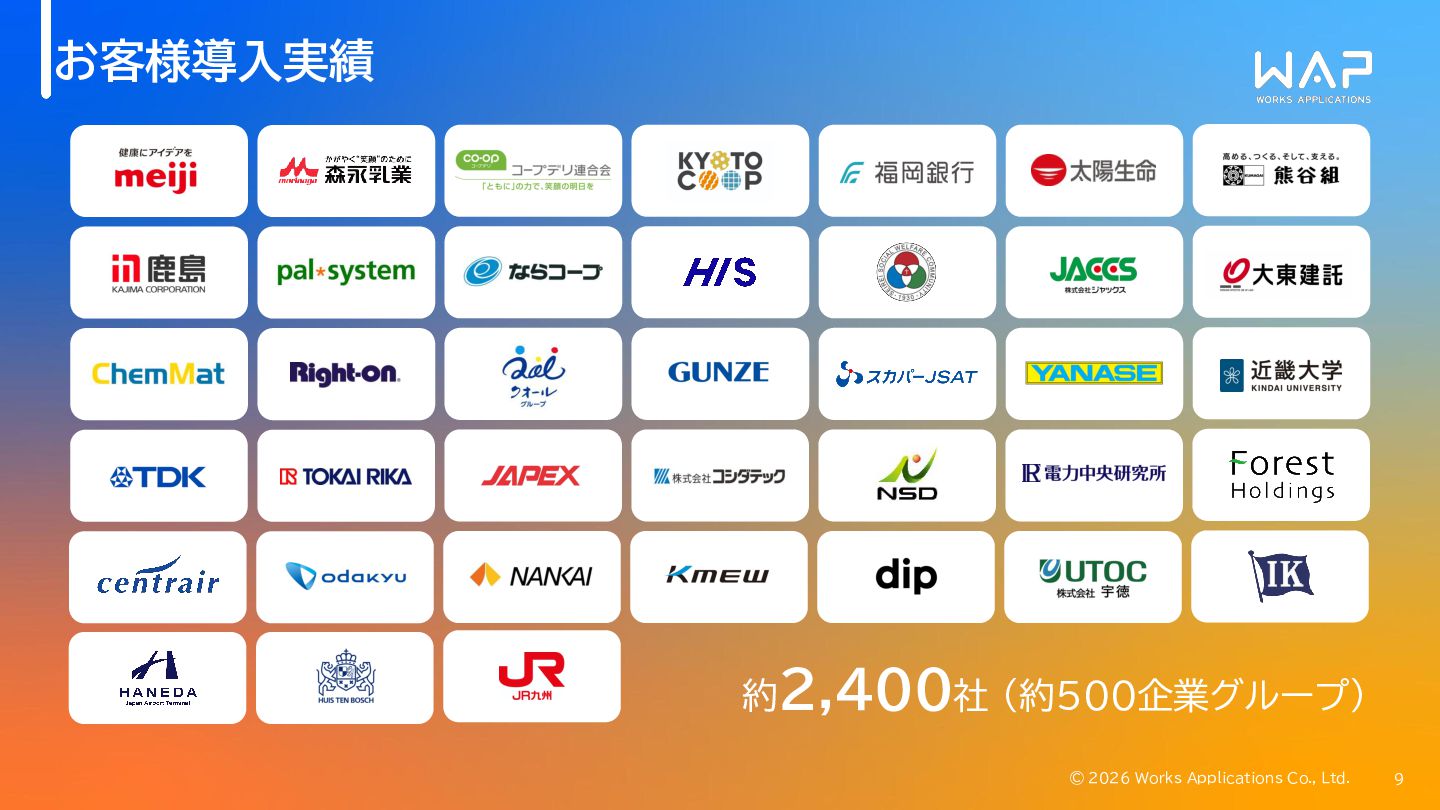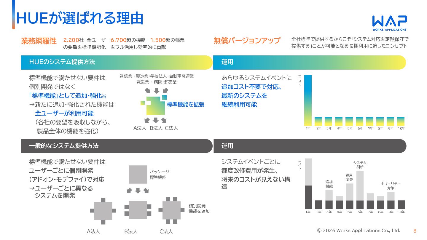あらゆるシステムイベントに 追加コスト不要で対応、 最新のシステムを 継続利用可能 コ ス ト 1年 2年 3年 4年 5年 6年 7年 8年 9年 10年 時間 標準機能で満たせない要件は ユーザーごとに個別開発 (アドオン・モデファイ)で対応 →ユーザーごとに異なる システムを開発 システムイベントごとに 都度改修費用が発生、 将来のコストが見えない構 造 時間 追加 機能 運用 変更 システム 刷新 セキュリティ 対策 1年 2年 3年 4年 5年 6年 7年 8年 9年 10年 コ ス ト 標準機能で満たせない要件は 個別開発ではなく 「標準機能」として追加・強化※ →新たに追加・強化された機能は 全ユーザーが利用可能 (各社の要望を吸収しながら、 製品全体の機能を強化) ※標準機能化の時期は当社の裁量によります 一般的なシステム提供方法 運用 無償バージョンアップ 2,200社 全ユーザー の要望を標準機能化 6,700超の機能 1,500超の帳票 をフル活用し効率的に貢献 全社標準で提供するからこそ「システム対応を定額保守で 提供する」ことが可能となる長期利用に適したコンセプト 通信業 ・製造業・学校法人・自動車関連業 電鉄業 ・ 病院・卸売業 パッケージ 標準機能 A法人 B法人 C法人 標準機能を拡張 業務網羅性 A法人 B法人 C法人 個別開発 機能を追加