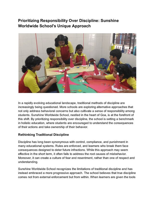 a rapidly evolving educational landscape, traditional methods of discipline are increasingly being questioned. More schools are exploring alternative approaches that not only address behavioral concerns but also cultivate a sense of responsibility among students. Sunshine Worldwide School, nestled in the heart of Goa, is at the forefront of this shift. By prioritizing responsibility over discipline, the school is setting a benchmark in holistic education, where students are encouraged to understand the consequences of their actions and take ownership of their behavior. Rethinking Traditional Discipline Discipline has long been synonymous with control, compliance, and punishment in many educational systems. Rules are enforced, and learners who break them face consequences designed to deter future infractions. While this approach may seem effective in the short term, it often fails to address the root causes of misbehavior. Moreover, it can create a culture of fear and resentment, rather than one of respect and understanding. Sunshine Worldwide School recognizes the limitations of traditional discipline and has instead embraced a more progressive approach. The school believes that true discipline comes not from external enforcement but from within. When learners are given the tools