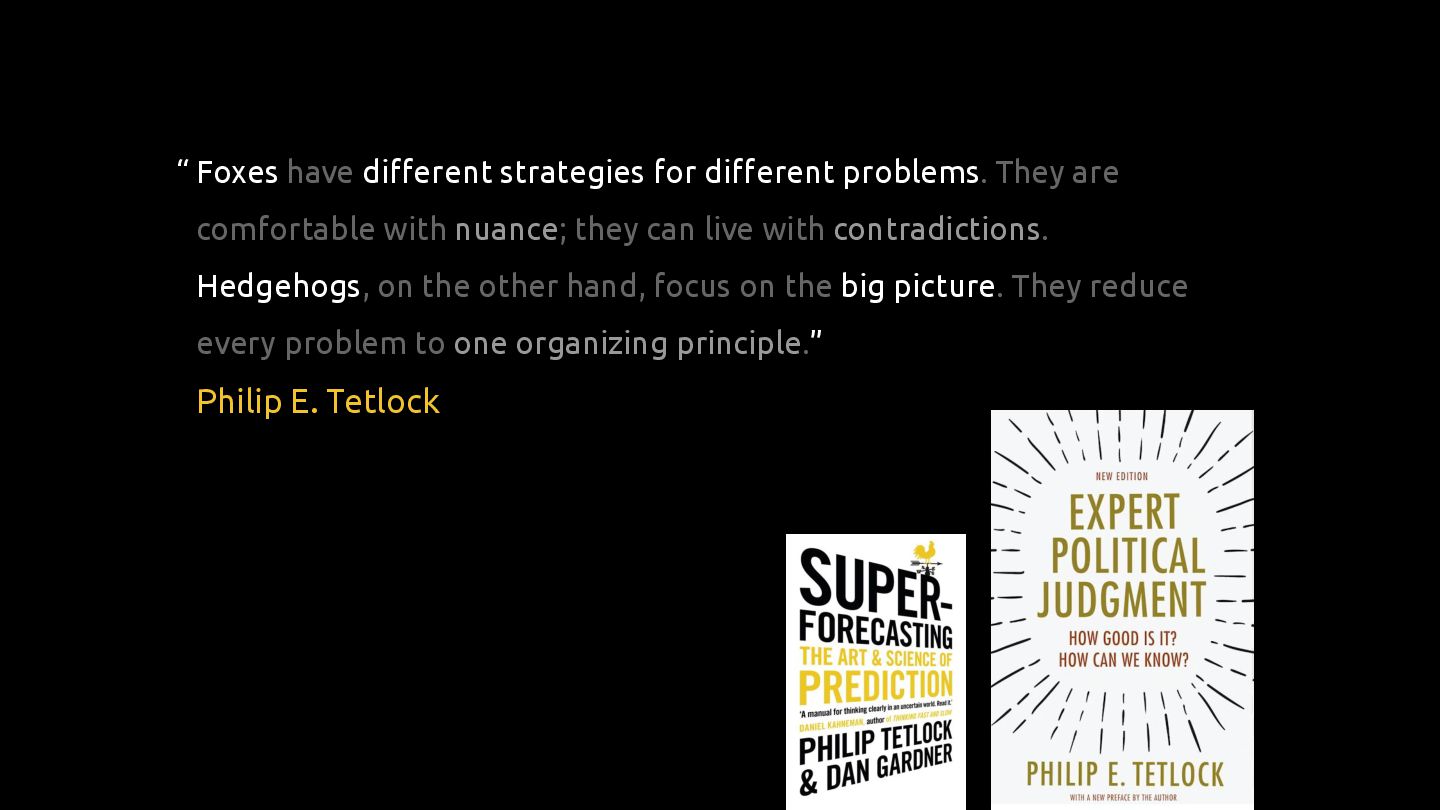 with nuance; they can live with contradictions. Hedgehogs, on the other hand, focus on the big picture. They reduce every problem to one organizing principle.” Philip E. Tetlock “
