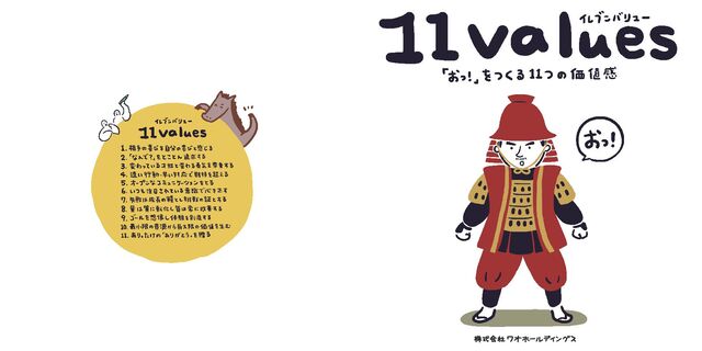 WOW Holdingsの企業理念「おっ!」をつくるために、指針となる価値観や行動規範を11項目にまとめ、それを11valuesと命名し冊子にまとめました。