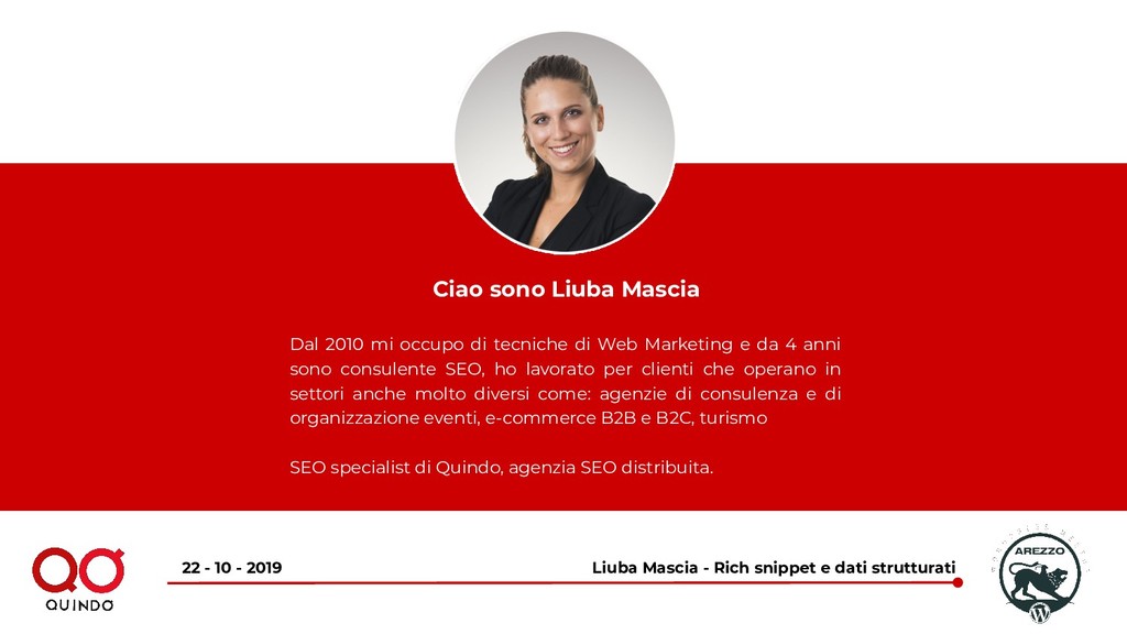 10 - 2019 Ciao sono Liuba Mascia Dal 2010 mi occupo di tecniche di Web Marketing e da 4 anni sono consulente SEO, ho lavorato per clienti che operano in settori anche molto diversi come: agenzie di consulenza e di organizzazione eventi, e-commerce B2B e B2C, turismo SEO specialist di Quindo, agenzia SEO distribuita.
