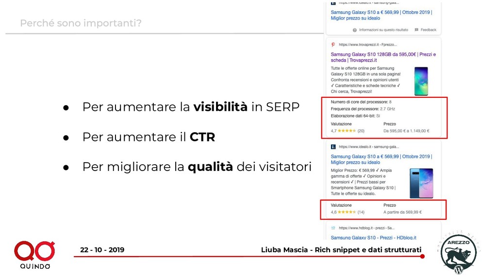 10 - 2019 • Perché aiutano i motori di ricerca a capire meglio il contenuto del tuo e-commerce • Perché aiutano a far comparire i rich snippet in serp (e aiutano gli utenti a capire meglio il contenuto del tuo e-commerce)